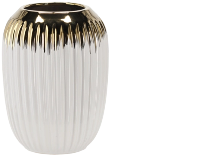 Ten stylowy biało‑złoty wazon podkreśli urodę świeżych i suszonych kwiatów, a jednocześnie stanowi wyrazisty element dekoracyjny. Ceramiczne wykonanie w połączeniu z błyszczącym złotym akcentem dopełnia zarówno nowoczesne, jak i klasyczne wnętrza.