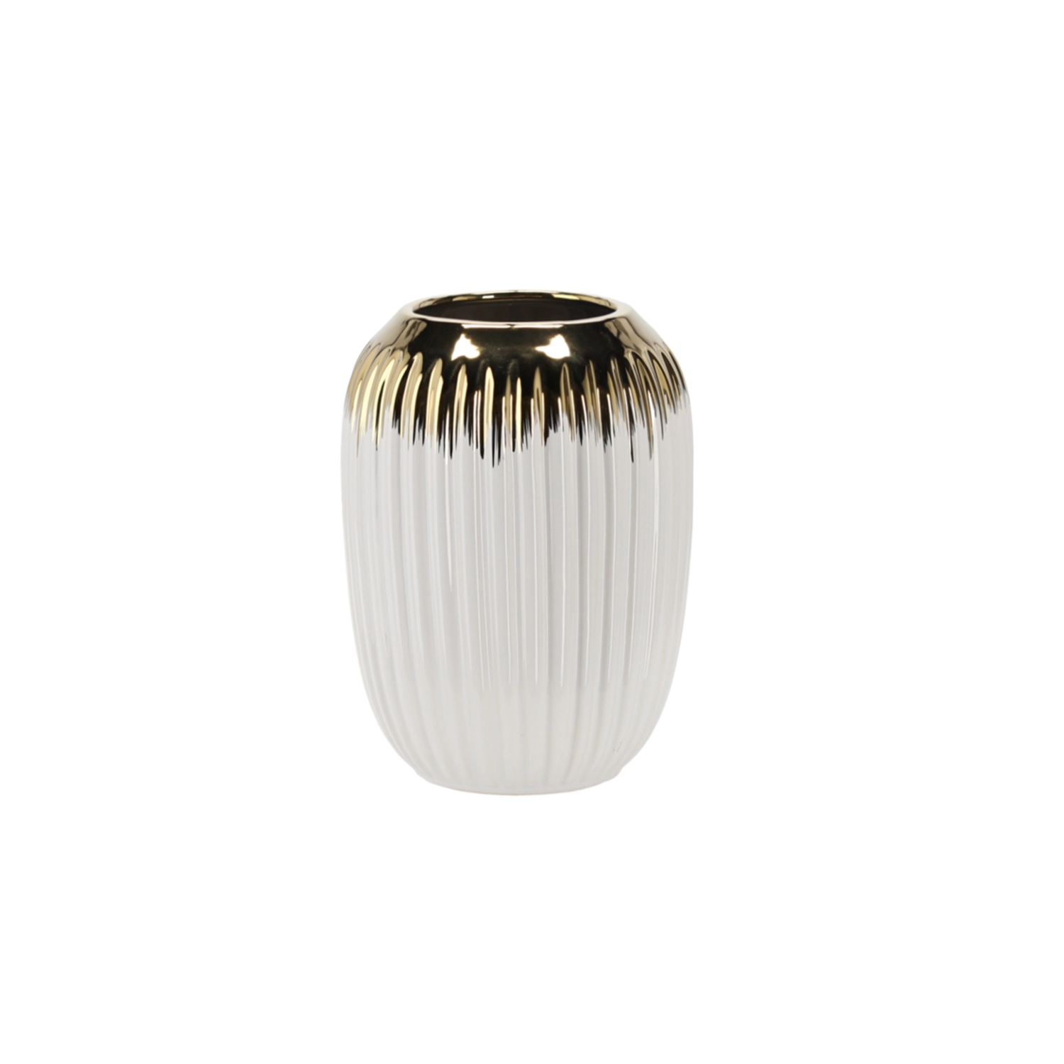 Elegancki ceramiczny wazon w połączeniu bieli i złota doda wnętrzu luksusowego akcentu. Dzięki kompaktowym wymiarom 15 × 15 × 20 cm sprawdzi się na stole, półce i komodzie. Materiał jest odporny na temperatury do −10 °C, więc wazon można krótkotrwale używać także w chłodniejszych pomieszczeniach.