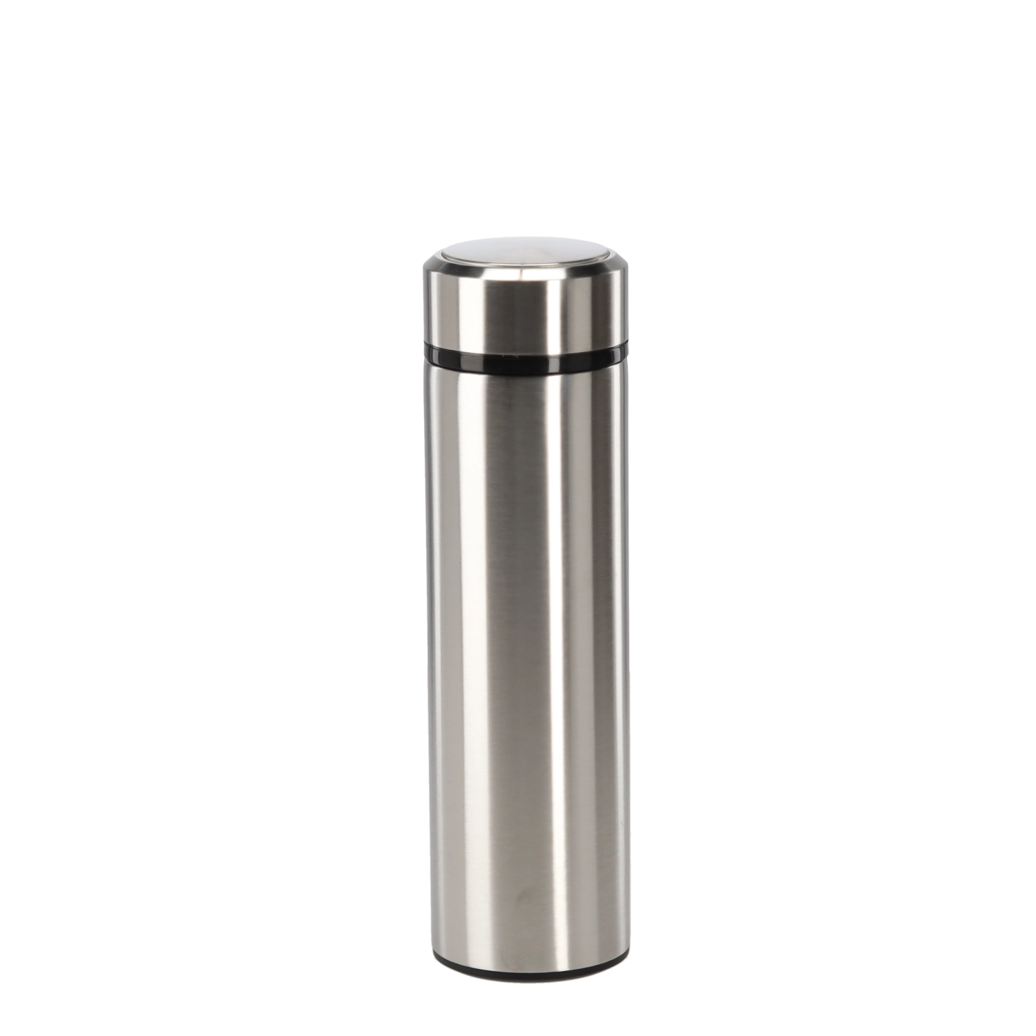 Minimalistyczne wykonanie w oryginalnym, naturalnym kolorze stali nierdzewnej bez powłoki wykończeniowej uzupełnia czarny plastik PP dla wygodnego chwytu. Smukły kształt o średnicy 6,5 cm świetnie leży w dłoni i pasuje do uchwytów w samochodzie. Dzięki niskiej masie 288 g termokubek jest idealny do codziennego użytkowania, do biura i na wycieczki.