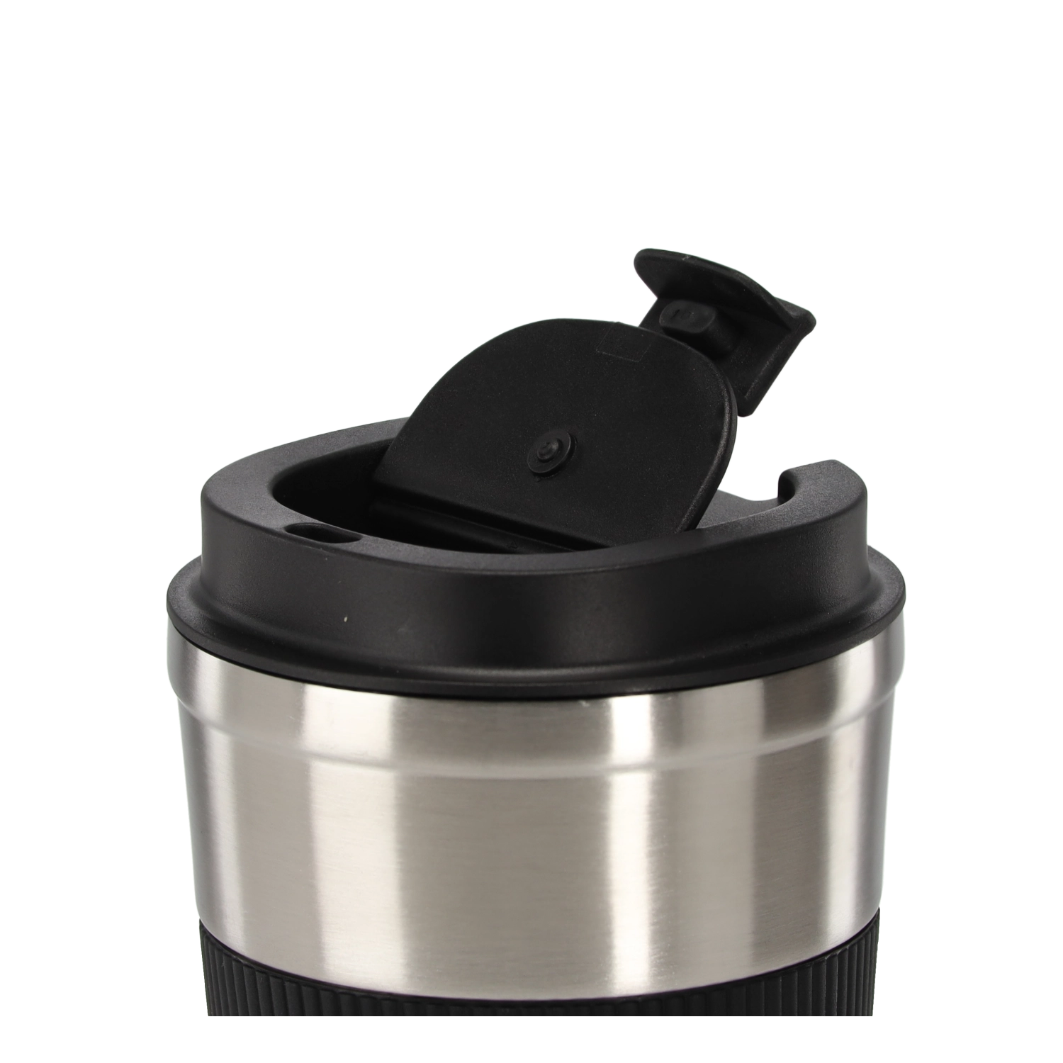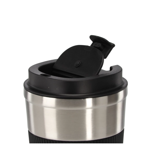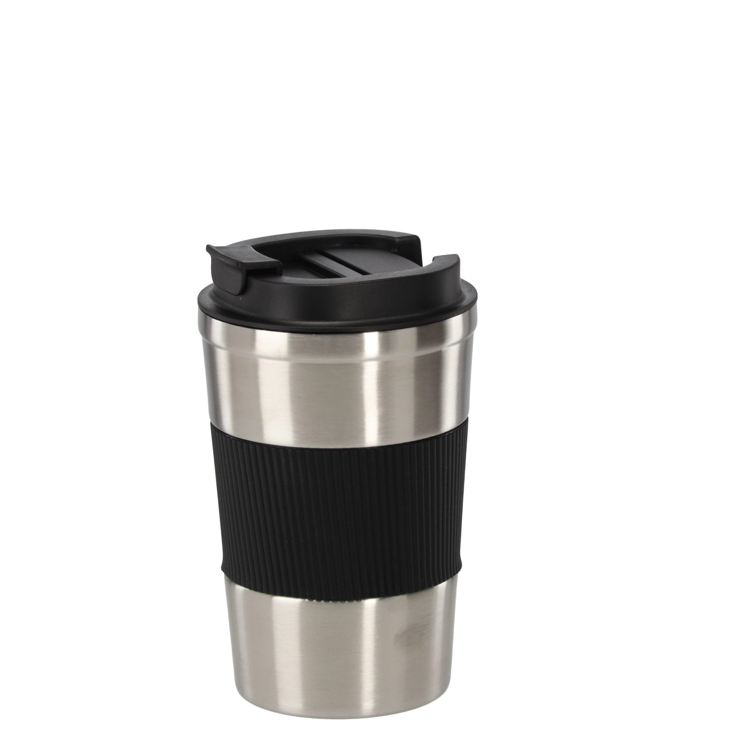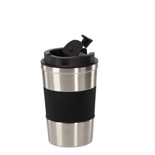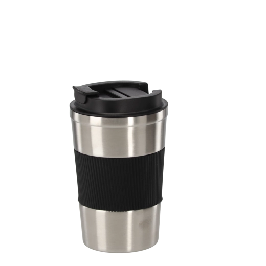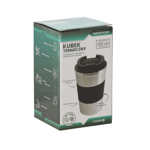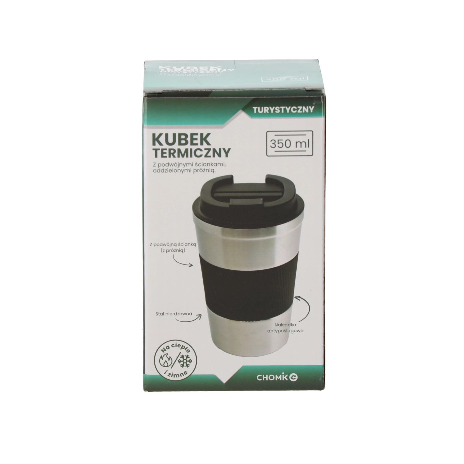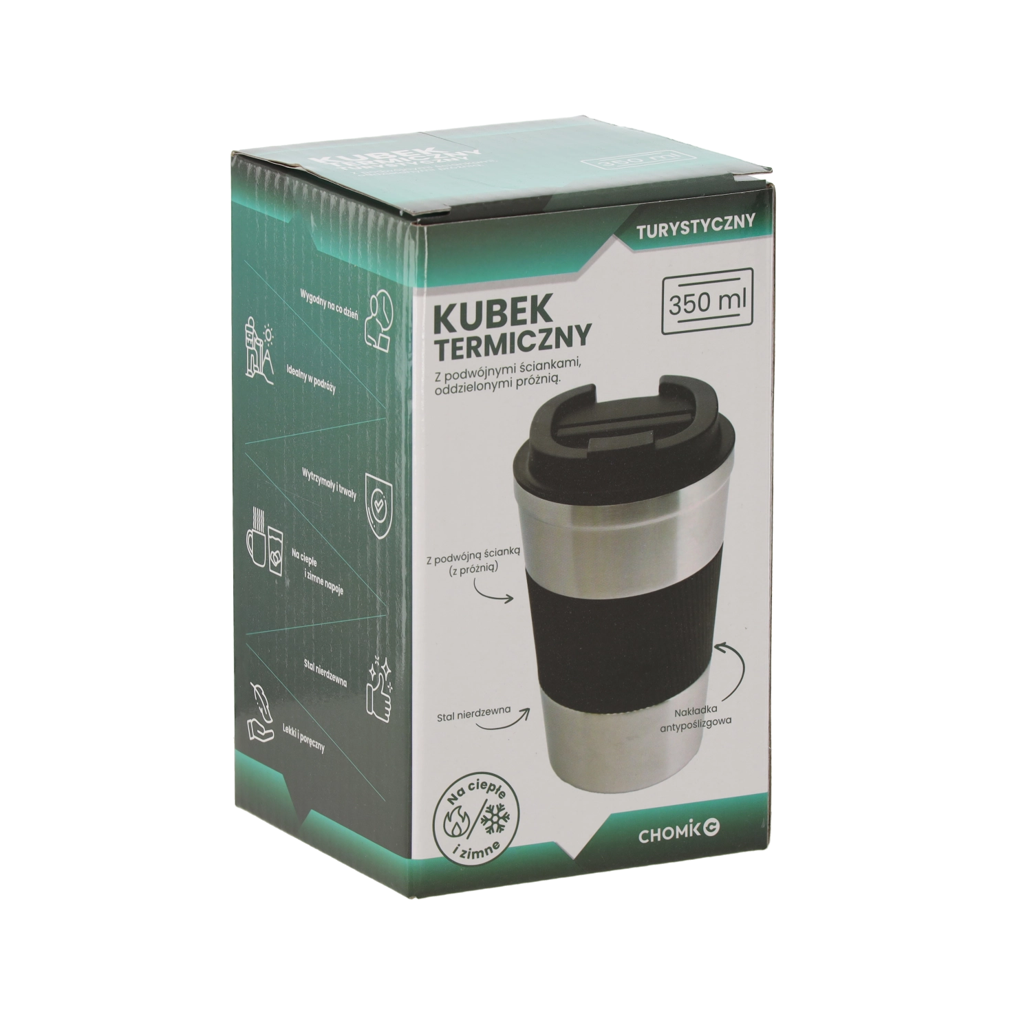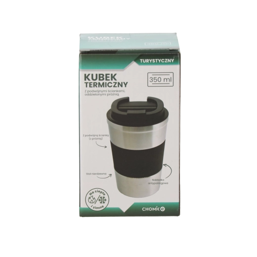 Praktyczny kubek termiczny o pojemności 350 ml z wysokiej jakości stali nierdzewnej z konstrukcją próżniową utrzymuje napój ciepły lub zimny do 4 godzin. Ma antypoślizgową silikonową opaskę dla pewnego chwytu, zakręcane wieczko z wytrzymałego PP i jest odpowiedni do mycia w zmywarce. Eleganckie wykończenie w naturalnym kolorze stali nierdzewnej sprawdzi się w pracy, samochodzie i na wycieczkach.