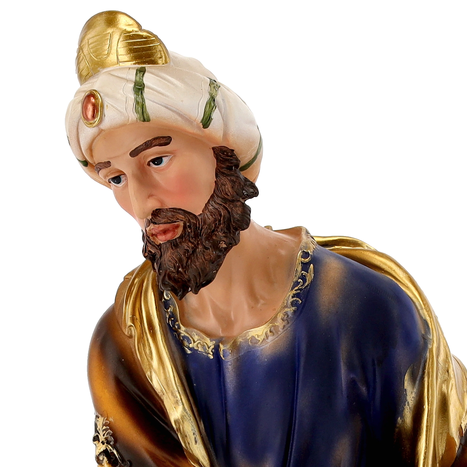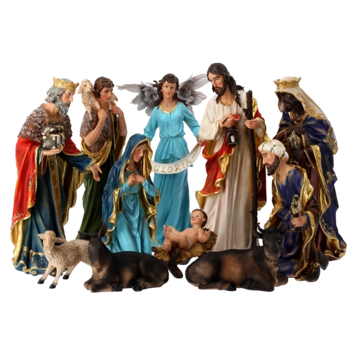 Każda figurka zachwyca delikatnymi rysami twarzy, precyzyjnymi fałdami szat i złotymi akcentami. Dzięki ręcznemu malowaniu scena wygląda żywo i odświętnie.