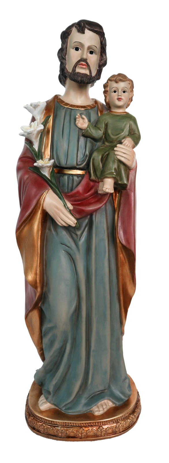 Elegancka figura świętego Józefa z Jezusem o wysokości 61 cm to ponadczasowa sakralna dekoracja do wnętrz i na zewnątrz. Wyróżnia się ręcznie malowanymi detalami, odpornością na warunki atmosferyczne oraz stabilną podstawą. Idealna do domowego kącika modlitewnego, ogrodu, kapliczki i kościoła.