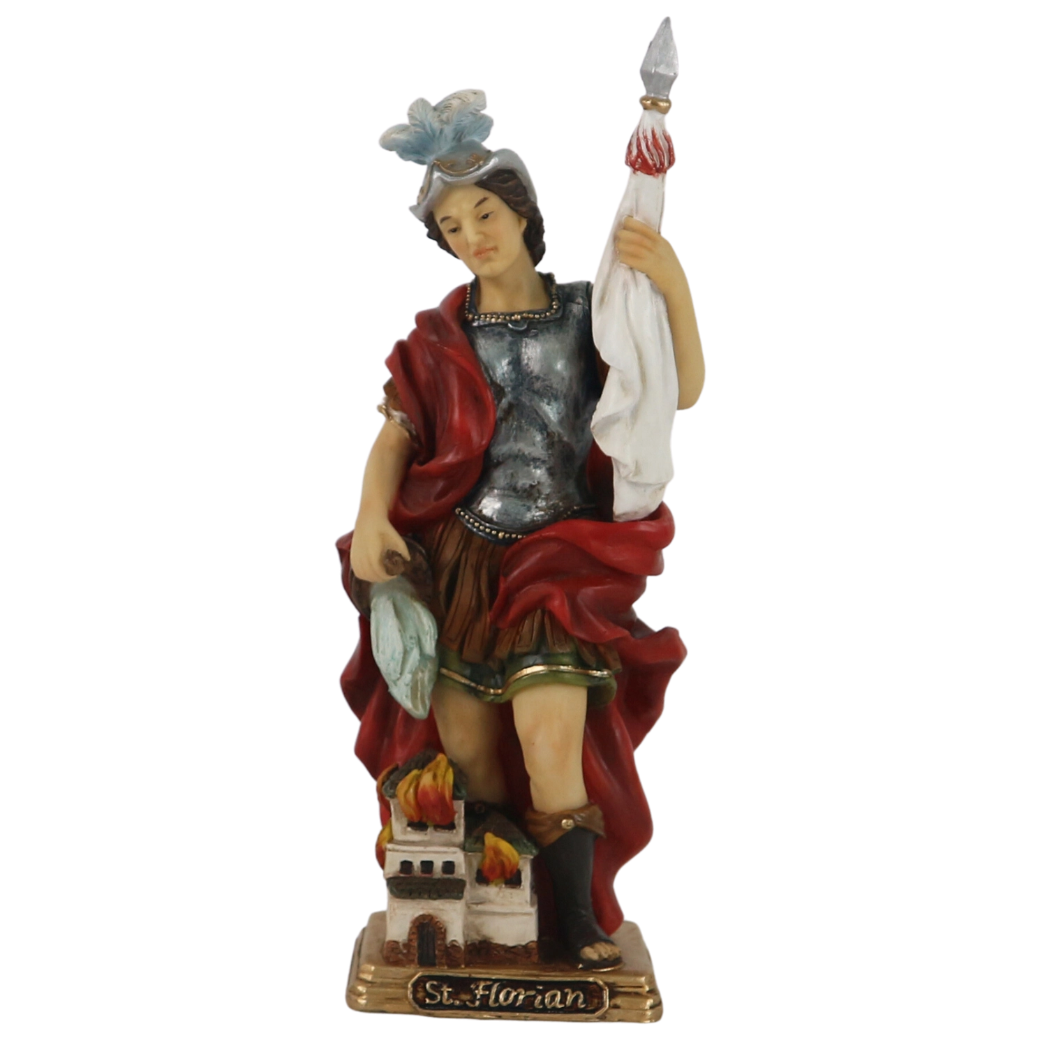 Figurka św. Floriana w zbroi, z płaszczem i chorągwią wyróżnia się ręcznym malowaniem oraz starannie modelowanymi detalami, które nadają postaci wyrazistość i głębię.