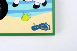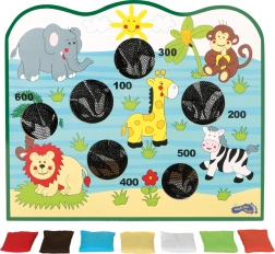 Plansza z kolorowymi ilustracjami zwierząt i kolorowe woreczki sprawiają, że gra jest atrakcyjna i zabawna dla dzieci.