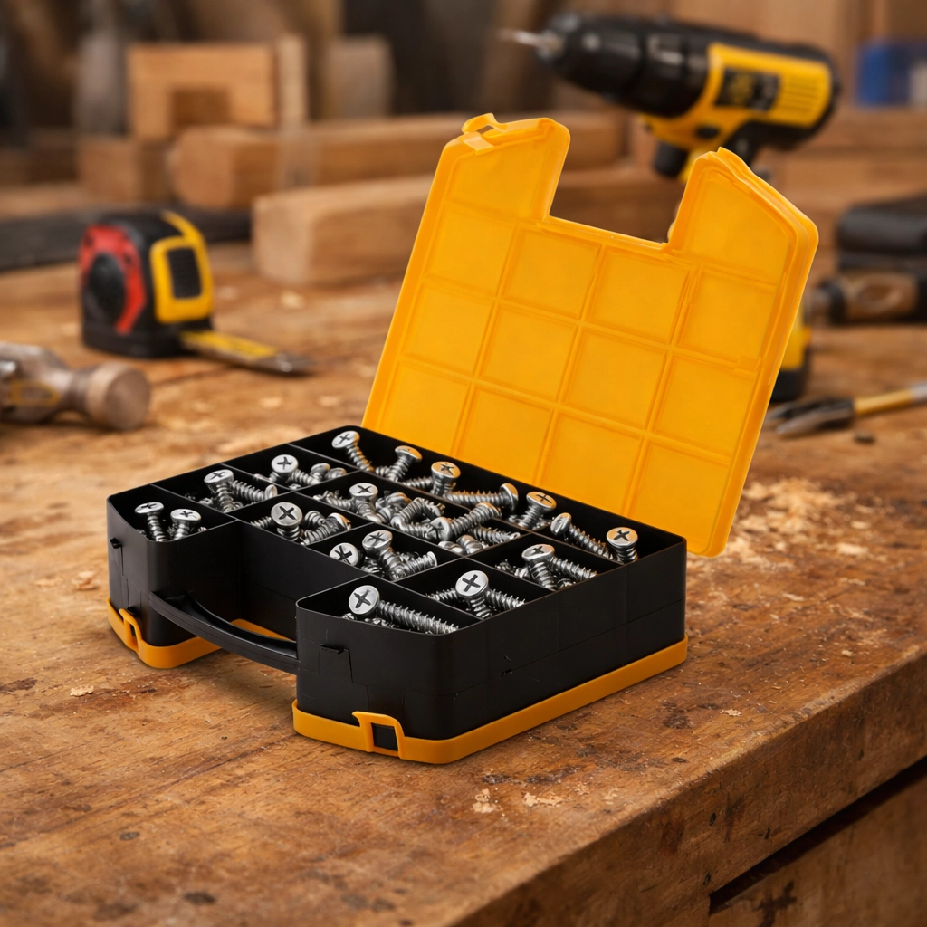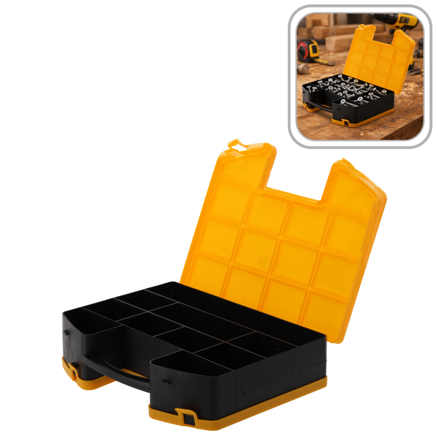 Utrzymuj porządek w swoich drobnych akcesoriach z kompaktowym, dwustronnym organizerem. Dzięki sprytnemu układowi i 28 przegródkom wszystkie małe elementy będą zawsze na swoim miejscu i pod ręką. Idealny wybór dla majsterkowiczów, rzemieślników oraz do użytku domowego.