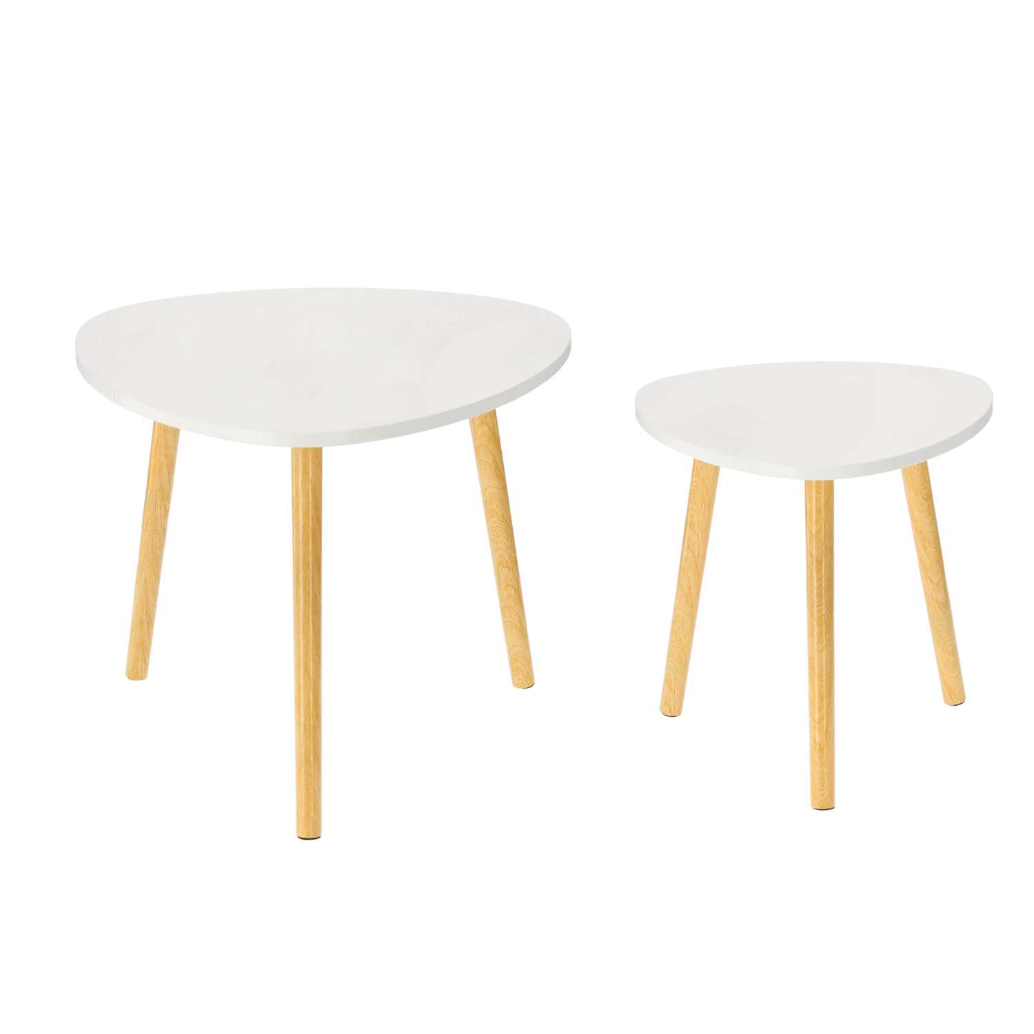 Stylowy zestaw dwóch stolików kawowych łączący białe blaty i naturalne drewniane nogi wnosi do wnętrza skandynawski minimalizm, lekkość formy oraz praktyczną zmienność. Nieregularny trójkątny/zaokrąglony kształt wygląda oryginalnie i sprawdzi się w salonie, sypialni i gabinecie.