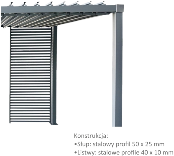 Kompatybilność: żaluzja przeznaczona do pergoli model TUN5122 (pergola dostępna w ofercie w celu stworzenia kompletnego zestawu).