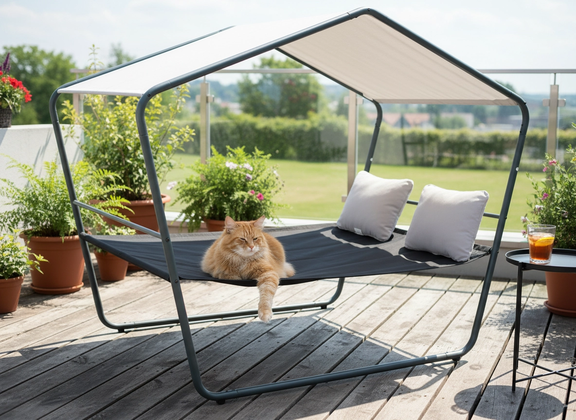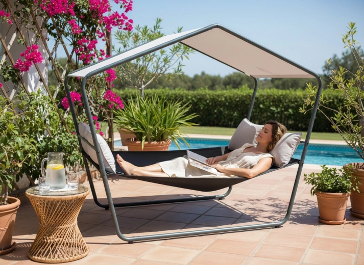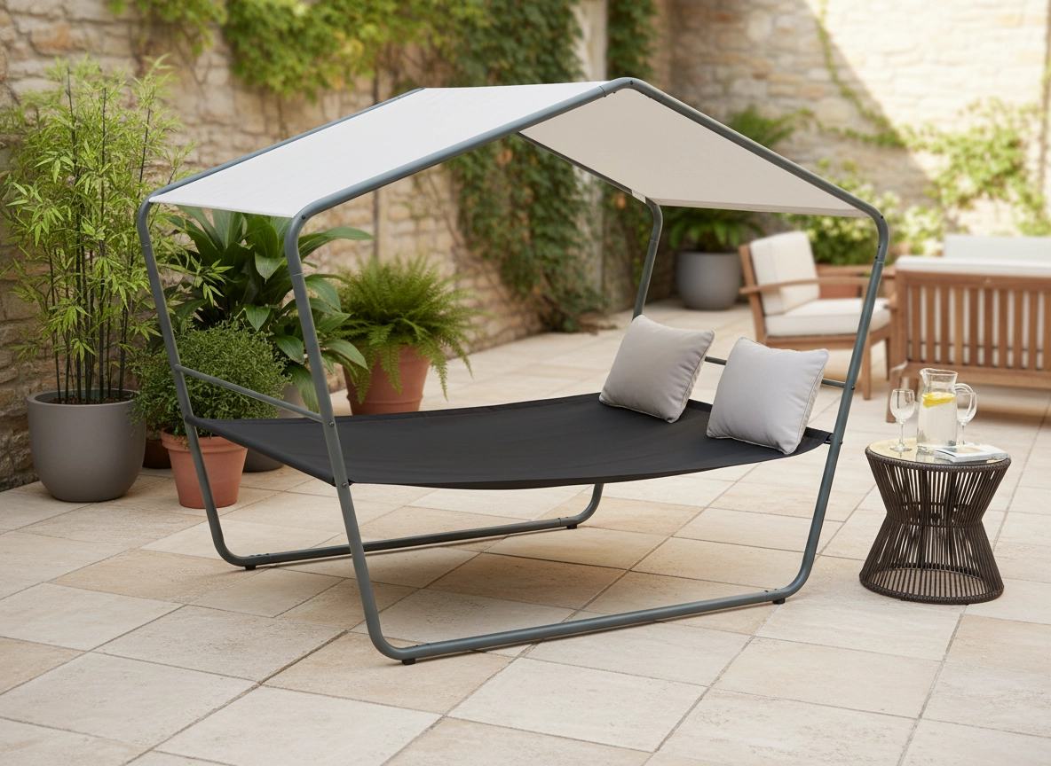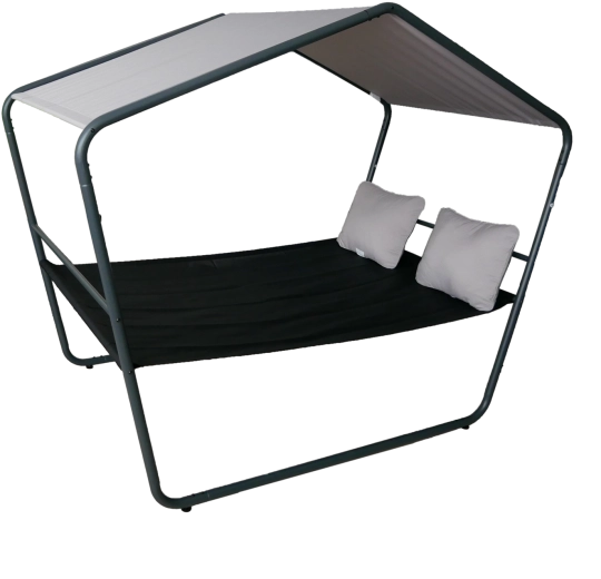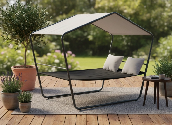 Ten podwójny ogrodowy leżak z daszkiem zamieni Twój taras w oazę spokoju. Stabilna metalowa konstrukcja, oddychająca siatka Textilene oraz zadaszenie zapewnią wygodę podczas upałów i po deszczu. Dzięki ponadczasowemu wyglądowi wpasuje się w nowoczesne i naturalne aranżacje zewnętrzne.