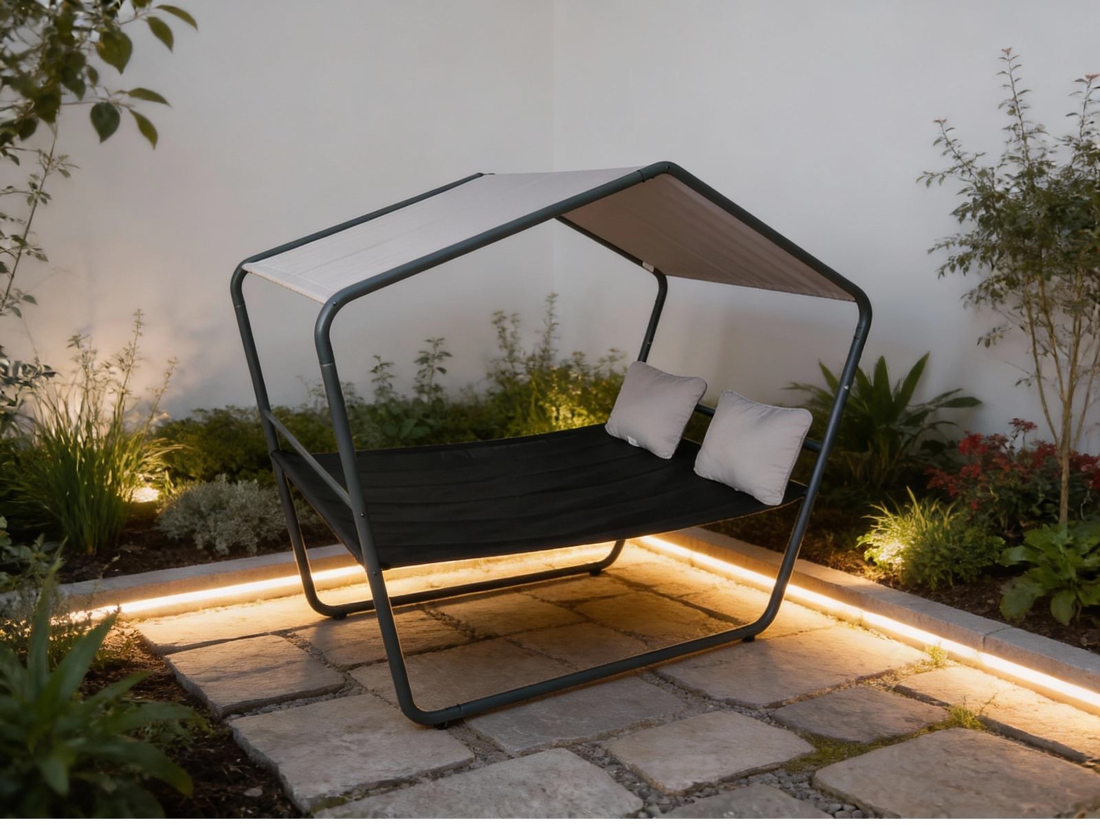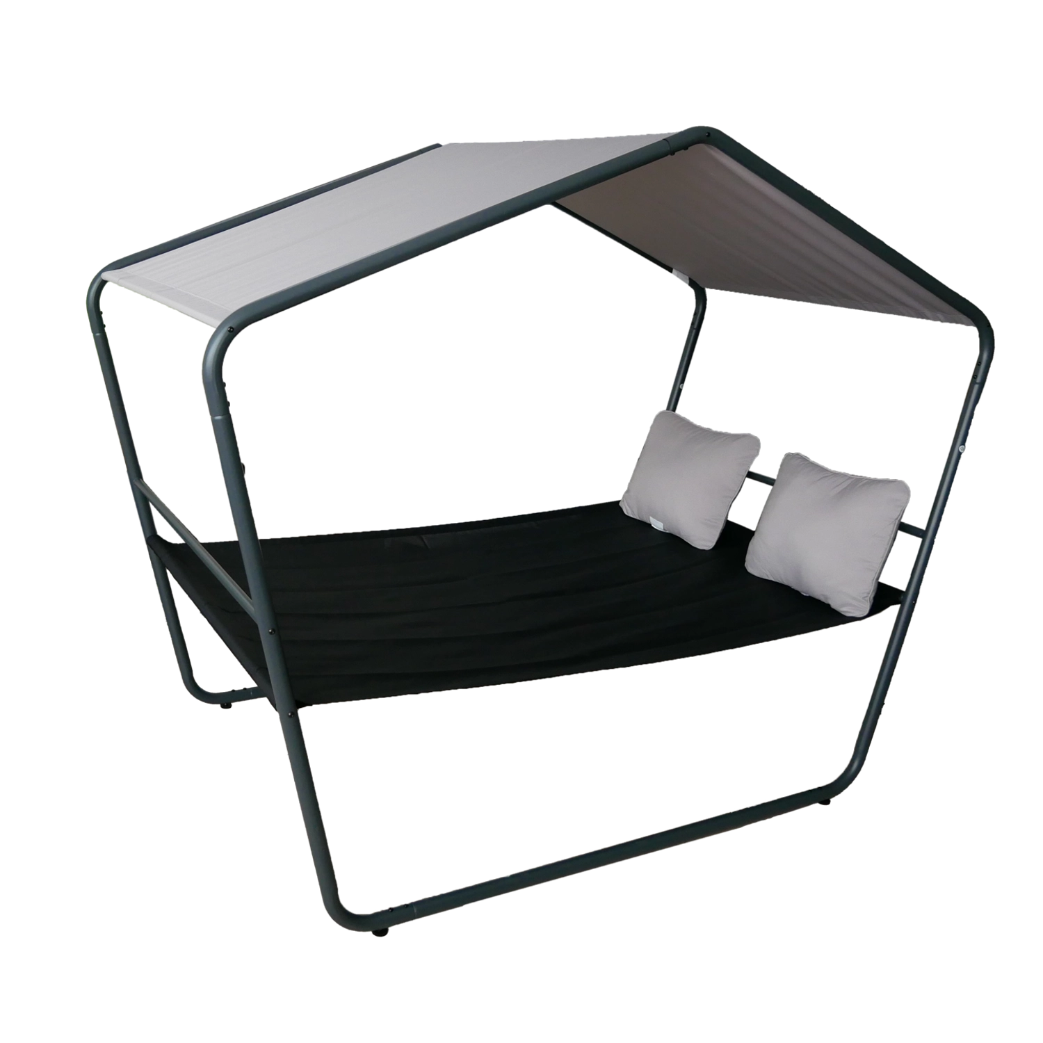 Praktyczna hydrofobowa tkanina daszku chroni przed słońcem i lekkim deszczem, powierzchnia do leżenia odporna na UV jest łatwa w pielęgnacji i szybko schnie. Dwie miękkie poduszki w jasnym odcieniu podkreślają komfort podczas czytania, odpoczynku i popołudniowej sjesty.