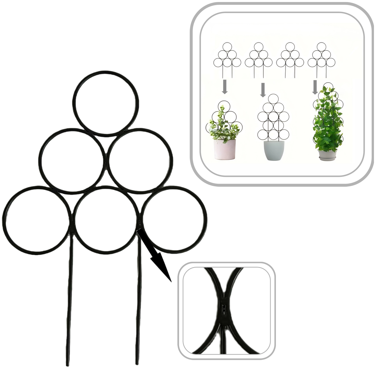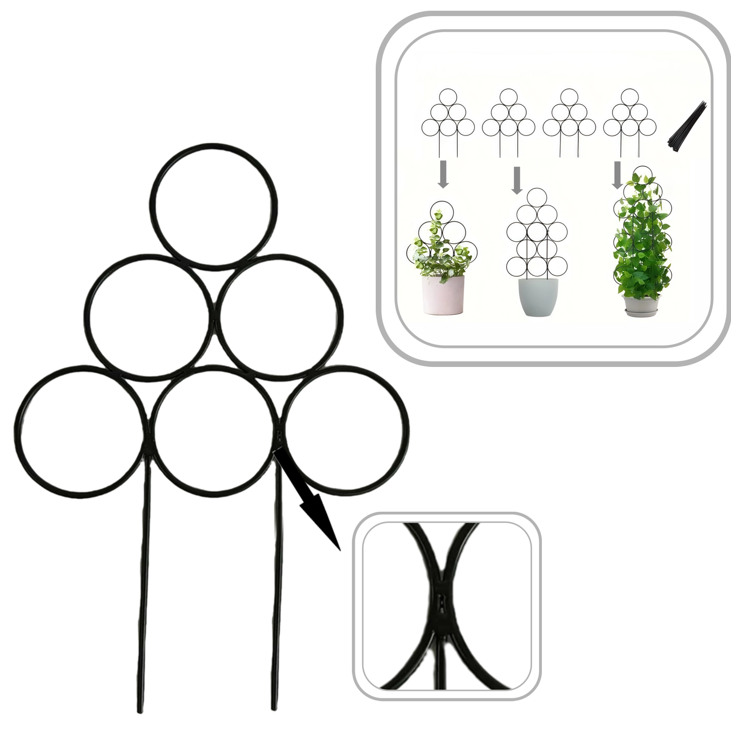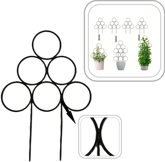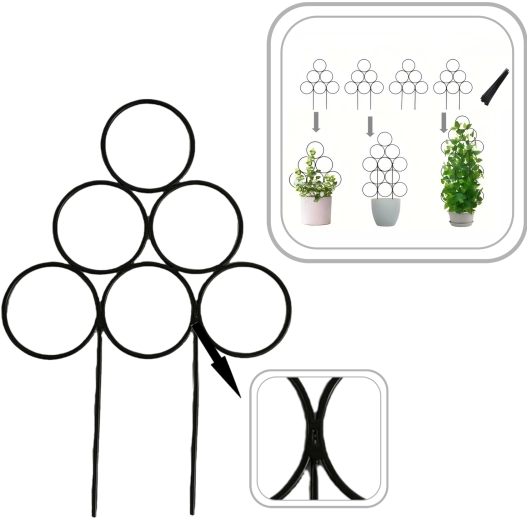 Montaż jest szybki i bez użycia narzędzi: wystarczy umieścić ją w doniczce i podpiąć pędy. Metalowy materiał gwarantuje długą żywotność i wytrzymałość, dzięki czemu rośliny zyskają pewne oparcie także w okresie intensywnego wzrostu.