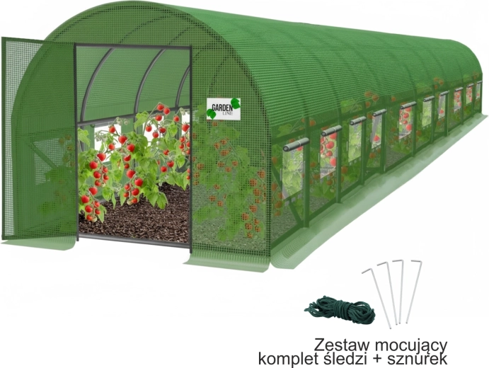 Fartuch ziemny do obsypania zwiększa stabilność na wietrze. W zestawie znajdują się śledzie do kotwienia oraz dodatkowe tyczki dla roślin pnących (pomidory, ogórki, groszek) ułatwiające podwiązywanie i zwiększające plon.