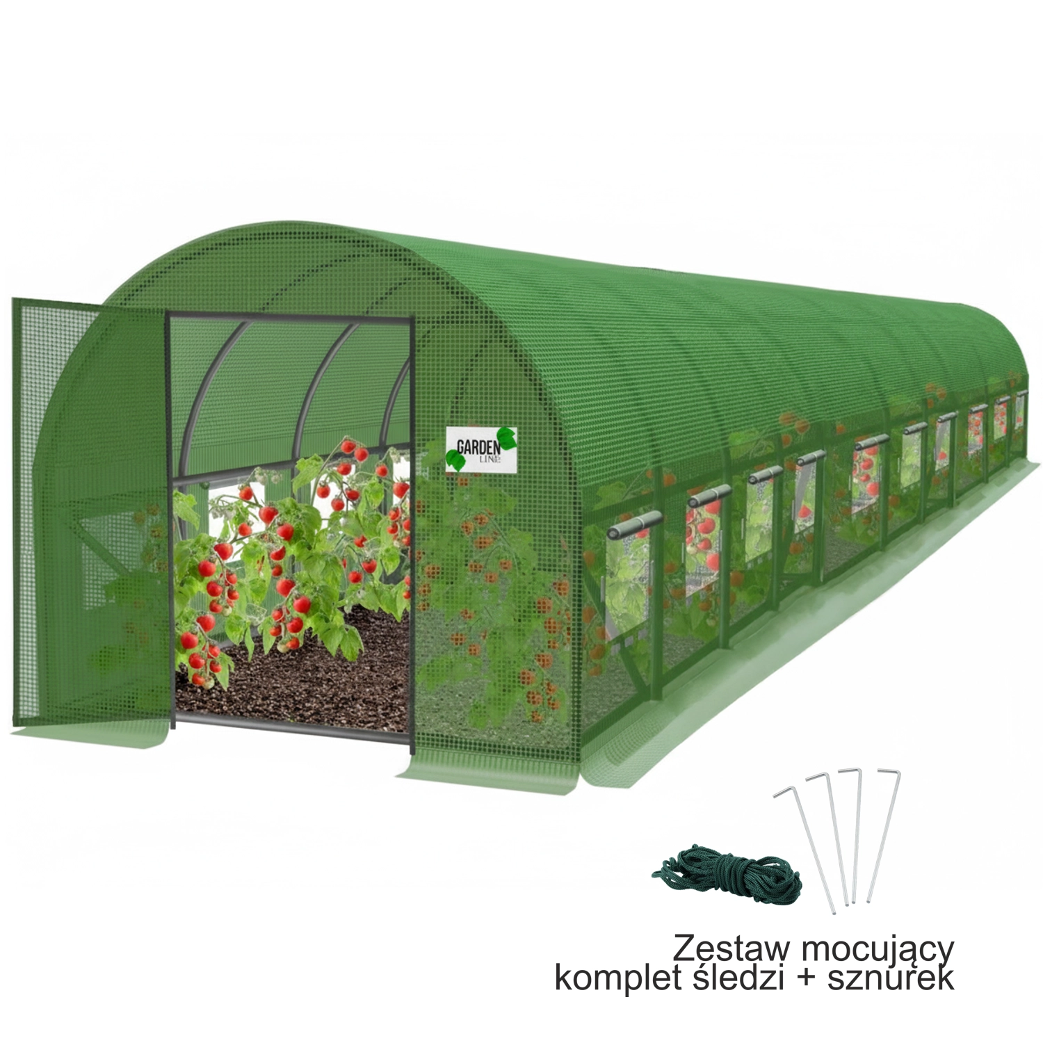 Duża przestrzeń 10 × 5 × 2 m tworzy idealne warunki do uprawy warzyw i rozsady od wiosny do późnej jesieni. Wzmocniona folia PE 140 g/m² z UV4 z wbudowaną siatką PP jest odporna na rozdarcia i warunki atmosferyczne, a ocynkowana stalowa rama z rurami o średnicy Ø 25 mm utrzymuje konstrukcję stabilnie na miejscu.