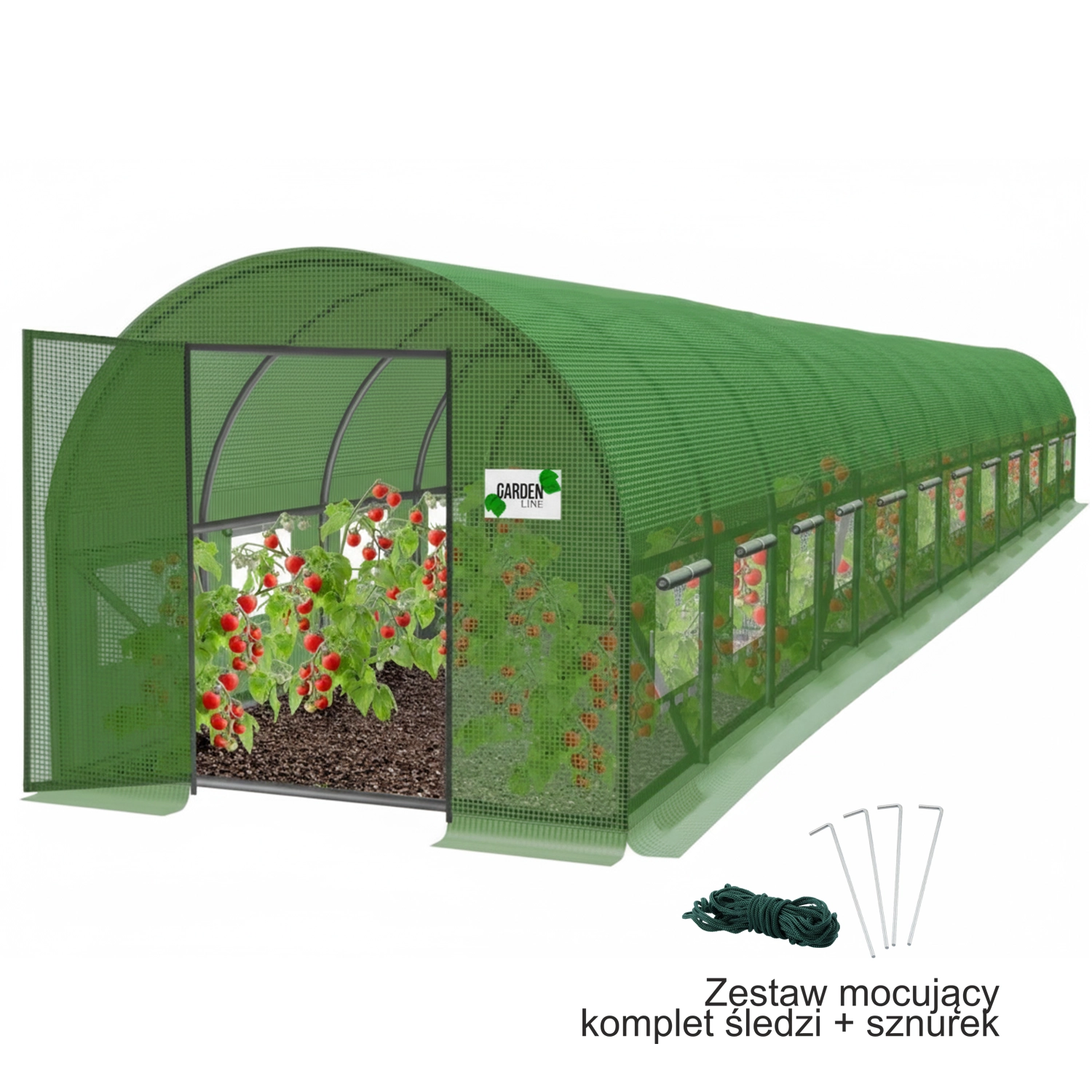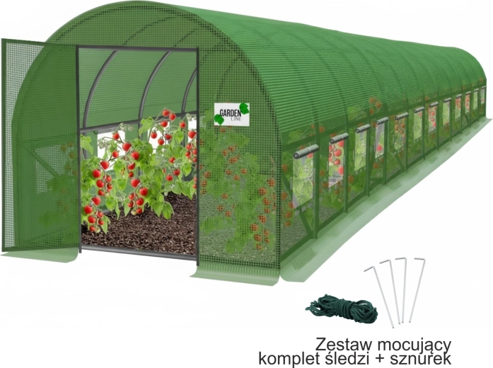 Wytrzymała, ocynkowana rama z rur o średnicy Ø 25 mm (grubość 0,65 mm) z fartuchem ziemnym oraz kołkami w zestawie gwarantuje stabilność. 24 okna wentylacyjne z moskitierą umożliwiają regulację przepływu powietrza, ograniczenie wilgoci i ochronę przed owadami. Dodatkowe górne poprzeczki ułatwiają prowadzenie roślin pnących (pomidory, ogórki, groszek).