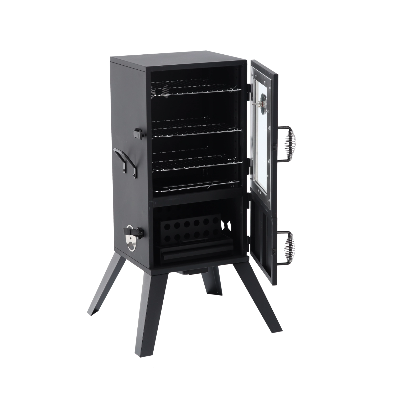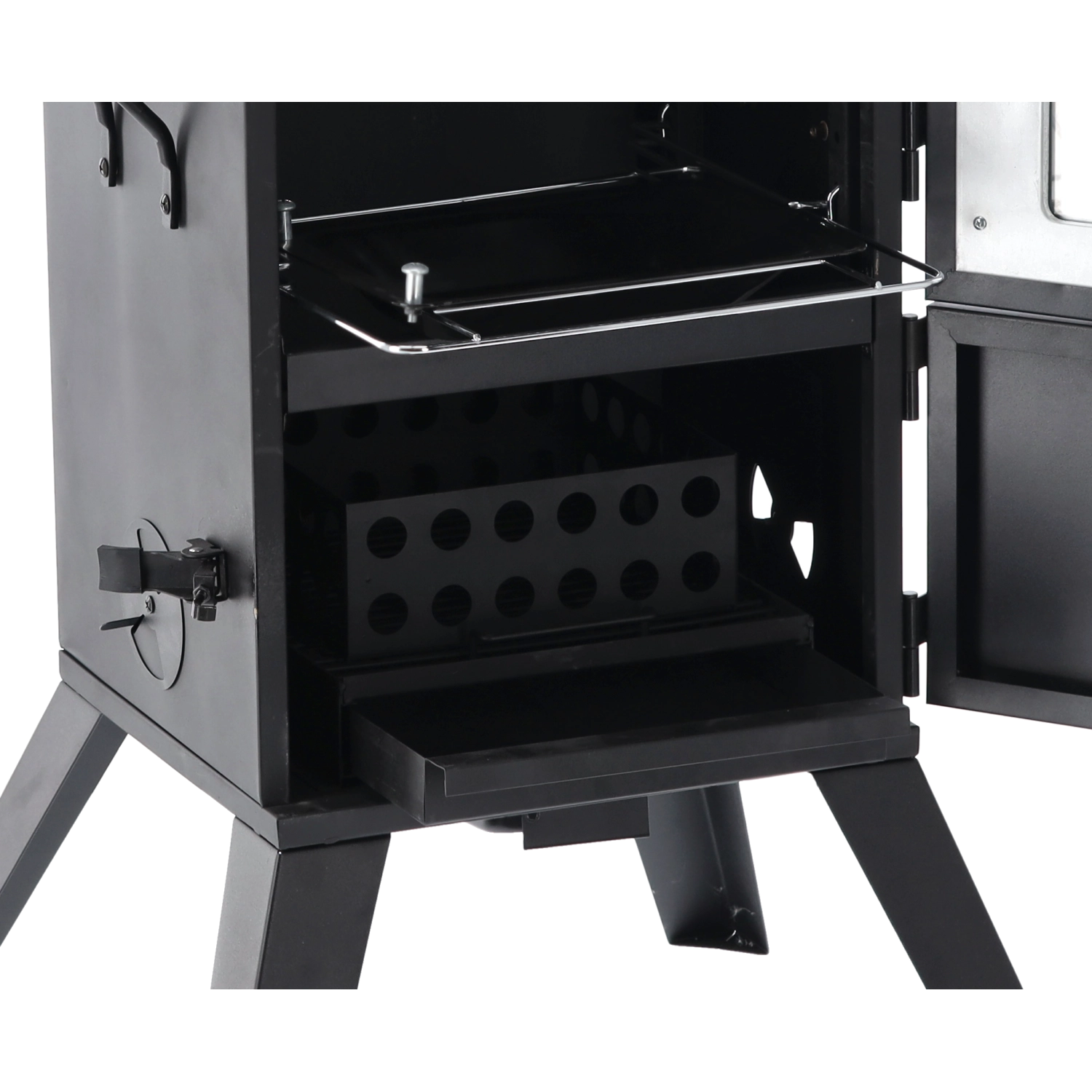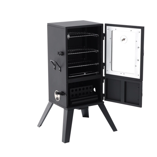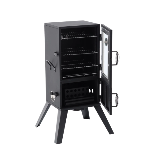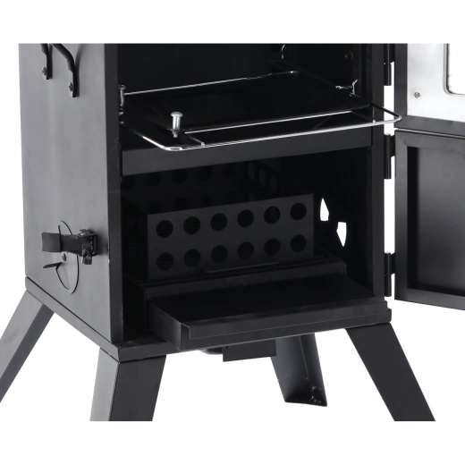 Wnętrze oferuje trzy poziomy rusztów dla większej pojemności i elastyczności. Emaliowana misa na wodę stabilizuje temperaturę i wilgotność, kosz na paliwo z otworami wentylacyjnymi wspiera równomierne spalanie, a wysuwany popielnik ułatwia czyszczenie. Trwała stal malowana proszkowo jest gotowa na długie lata użytkowania na zewnątrz.