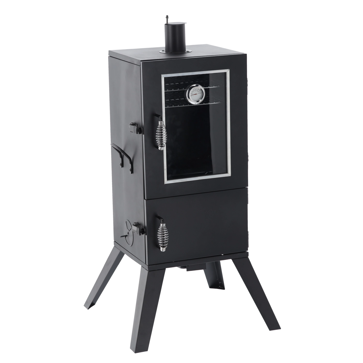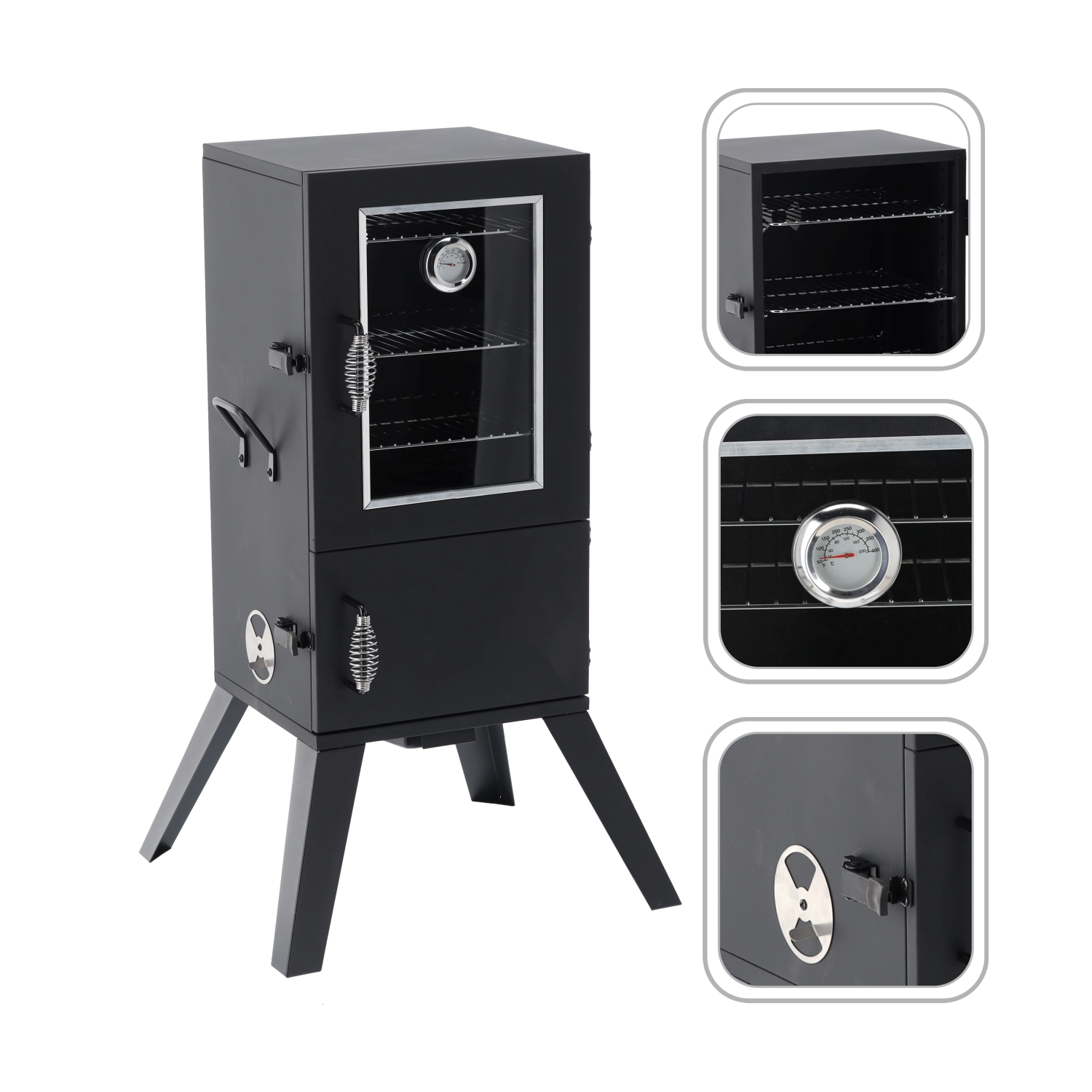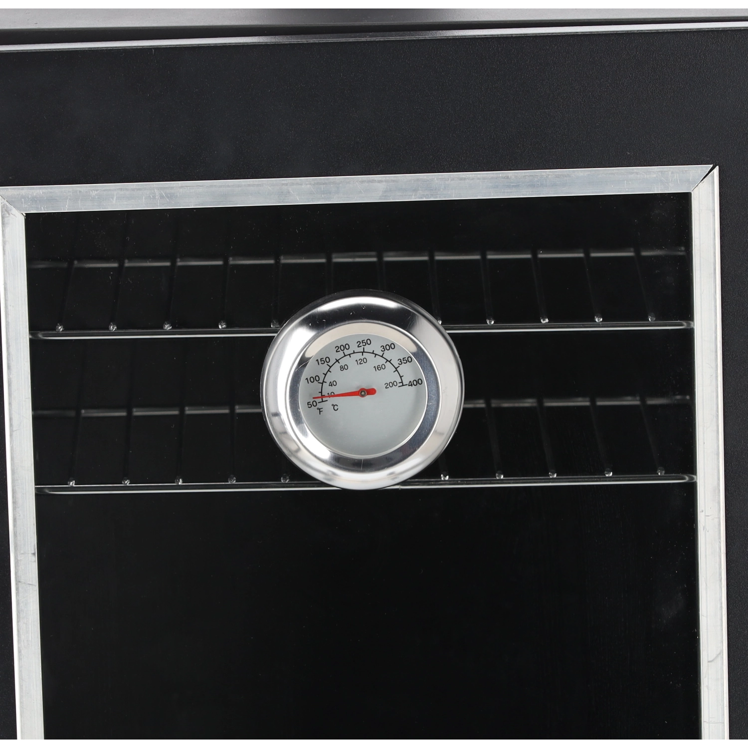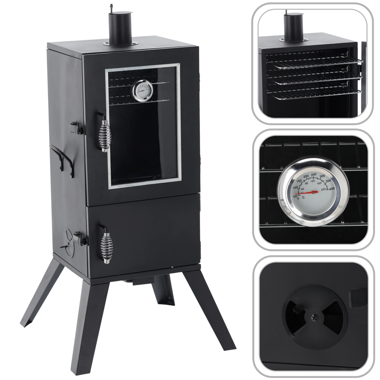 Wbudowany termometr, szklane okno w drzwiach, sprężynowe uchwyty, zamek drzwi, otwór wentylacyjny/komin