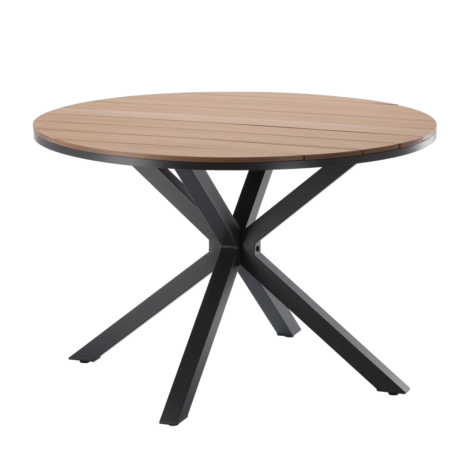 Elegancki okrągły stół ogrodowy łączy lekką i wytrzymałą aluminiową konstrukcję z odpornym blatem z polywoodu imitującym drewno. Nowoczesne ciemnoszare wykończenie doskonale pasuje na taras, balkon i do ogrodu, a dzięki łatwej pielęgnacji i odporności na warunki pogodowe zachowuje swój wygląd przez wiele sezonów.