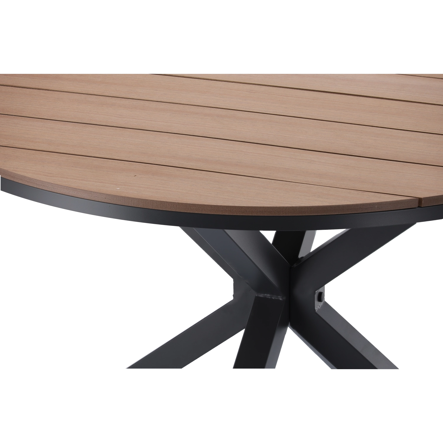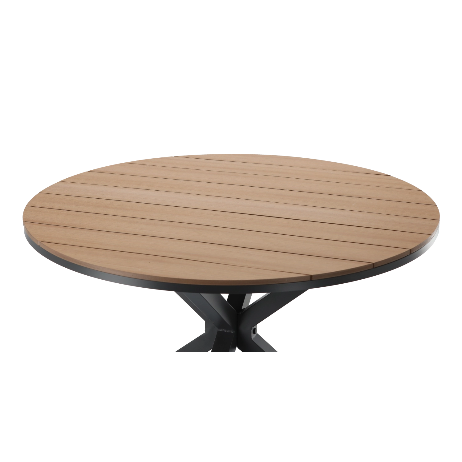 Ten okrągły stół zewnętrzny oferuje idealne połączenie stylu i funkcjonalności. Aluminiowa rama z lakierem proszkowym zapewnia wysoką odporność na korozję oraz niską masę ułatwiającą przenoszenie. Blat z polywoodu o wyglądzie desek nadaje naturalny charakter drewna, ale bez uciążliwej pielęgnacji.