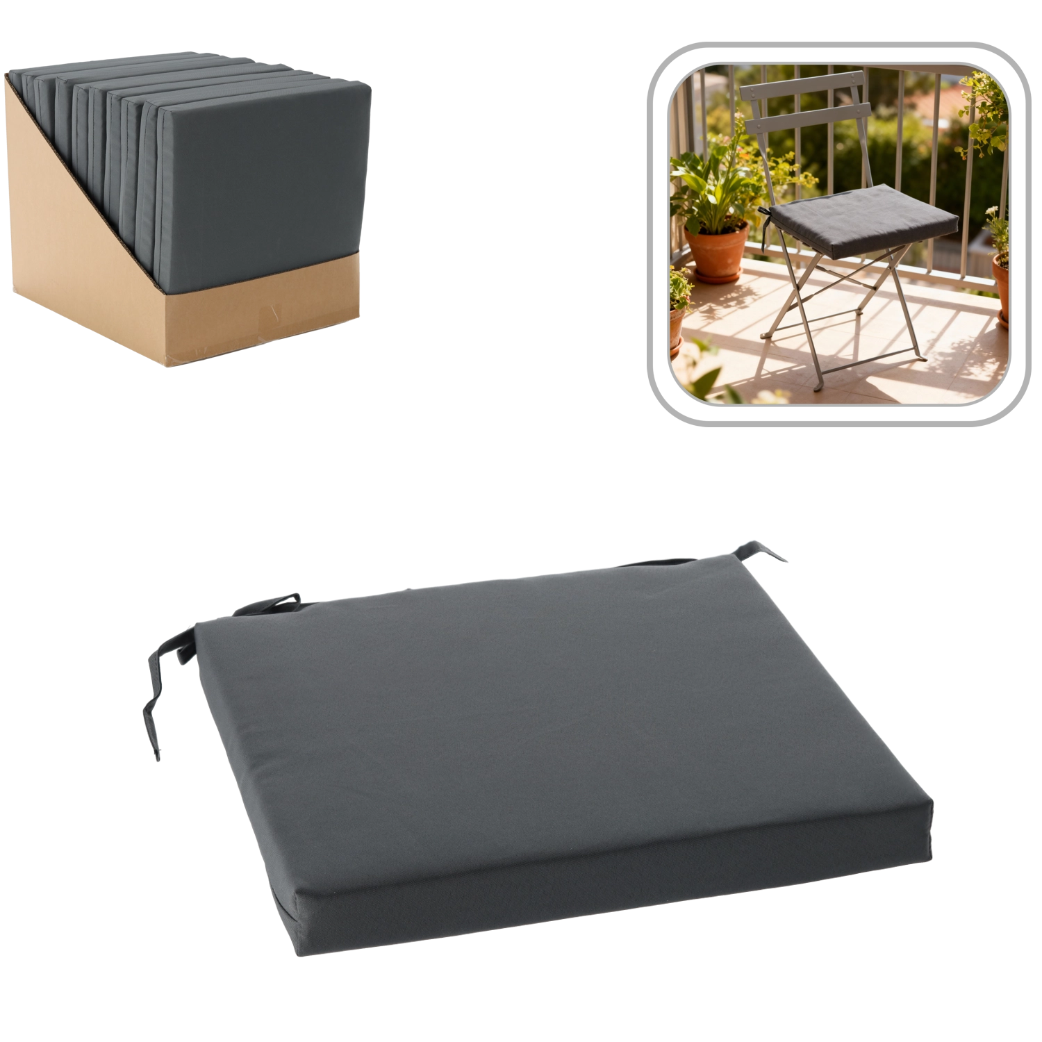 Udoskonal swoje miejsce do siedzenia dzięki uniwersalnej poduszce 40 × 40 × 5 cm w eleganckiej ciemnej szarości. Odporna na zachlapania tkanina oraz przyjemnie miękkie wypełnienie zapewniają wygodę podczas codziennego użytkowania w domu i na zewnątrz. Zintegrowane sznurki umożliwiają szybkie i bezpieczne przymocowanie do większości krzeseł.