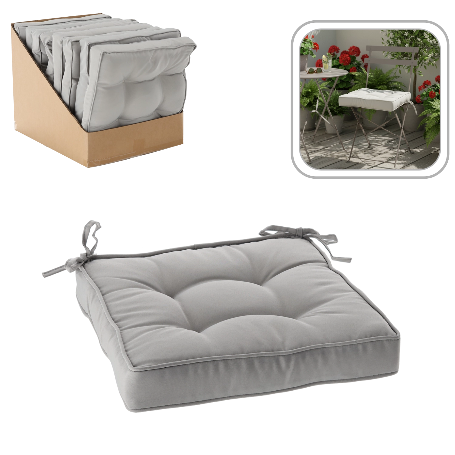 Stylowa, jasnoszara poduszka na krzesło o wymiarach 40 × 40 × 6 cm zapewnia komfortowe siedzenie w domu i w ogrodzie. Dzięki miękkiemu wypełnieniu z poliestru oraz wytrzymałemu pokryciu zachowuje kształt, jest przyjemna w dotyku i łatwa w pielęgnacji. Pętelki do wiązania gwarantują stabilność na krześle, a dekoracyjne pikowanie dodaje elegancji każdemu wnętrzu.