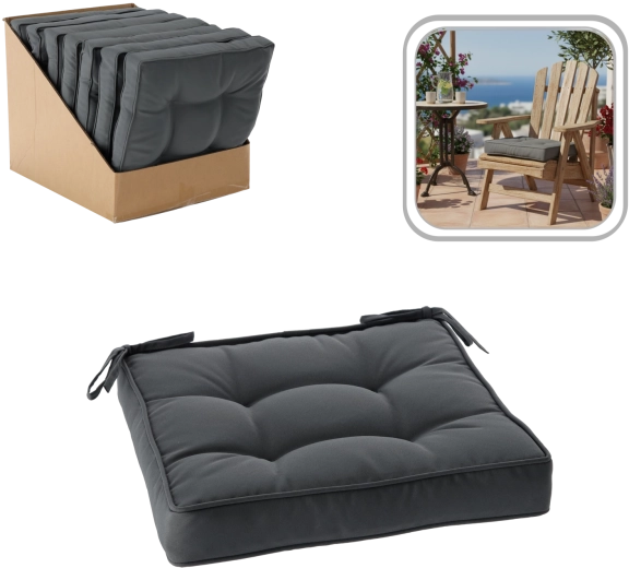 Trwała poszewka ze 100% poliestru jest przyjemna w dotyku i znosi codzienne użytkowanie oraz drobne zabrudzenia. Grube wypełnienie z włókna poliestrowego zapewnia wygodę, a pikowanie w czterech punktach utrzymuje wypełnienie na miejscu. Dzięki dwóm troczkom mocującym siedzisko bezpiecznie trzyma się na większości krzeseł.