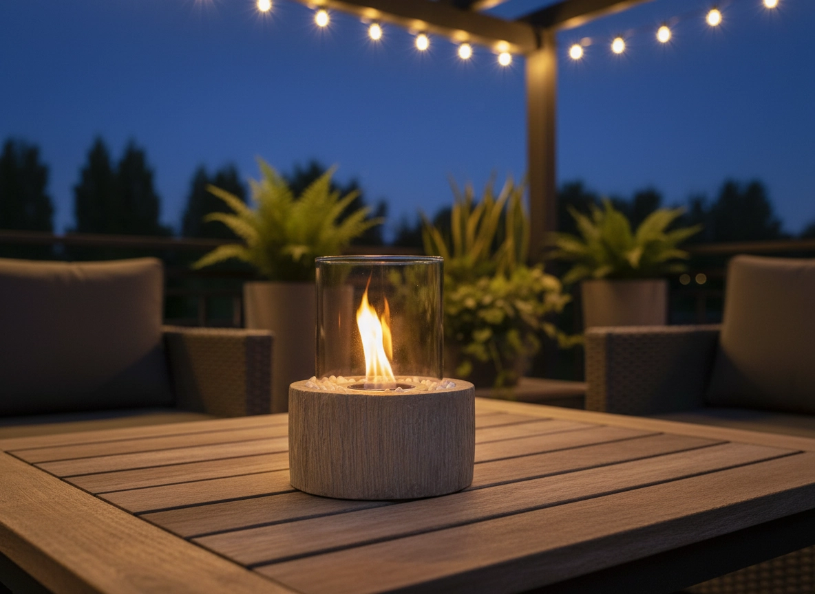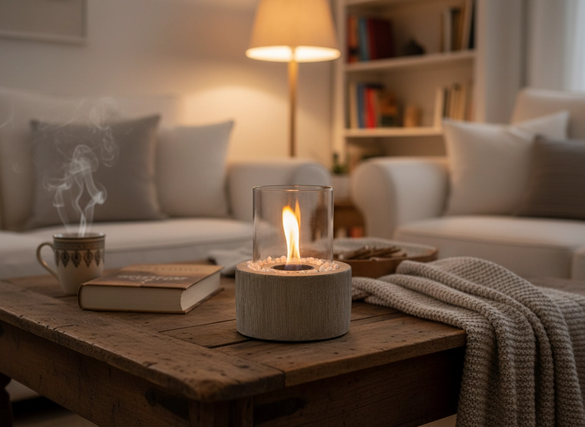 Stolikowy biokominek to elegancka dekoracja i źródło przyjemnego światła do relaksu przy kawie, książce czy podczas wieczornego spotkania. Szklany cylinder chroni płomień przed wiatrem, a białe kamyki podkreślają naturalny wygląd imitacji drewna. Biokominek idealny do salonu, na balkon i taras.