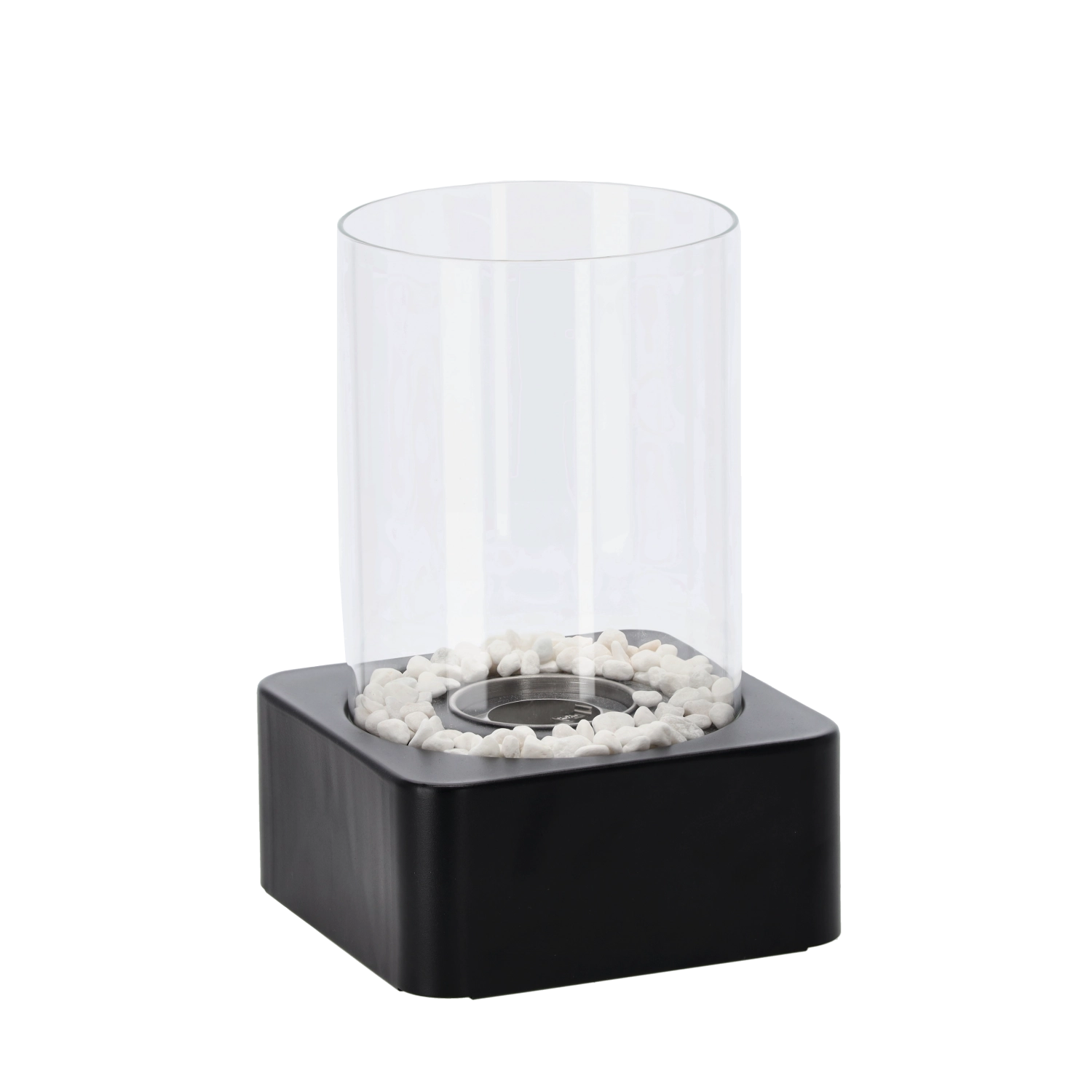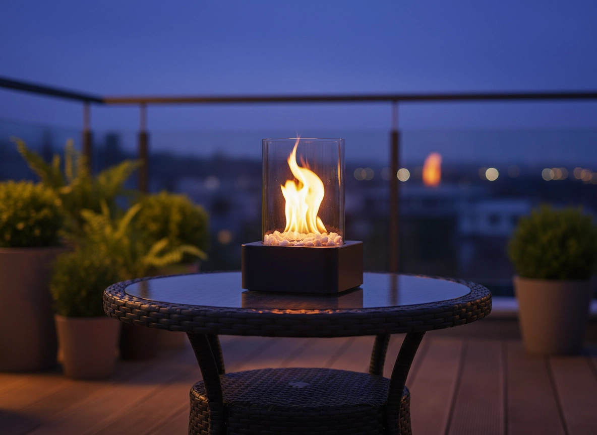 Stołowy biokominek to stylowy dodatek łączący nowoczesny wygląd z naturalnym światłem płomienia. Matowa czarna podstawa z dekoracyjnymi kamykami oraz cylindryczne szkło tworzą bezpieczną osłonę przed wiatrem i zapewniają stabilne spalanie, budując przytulny nastrój bez skomplikowanego montażu.