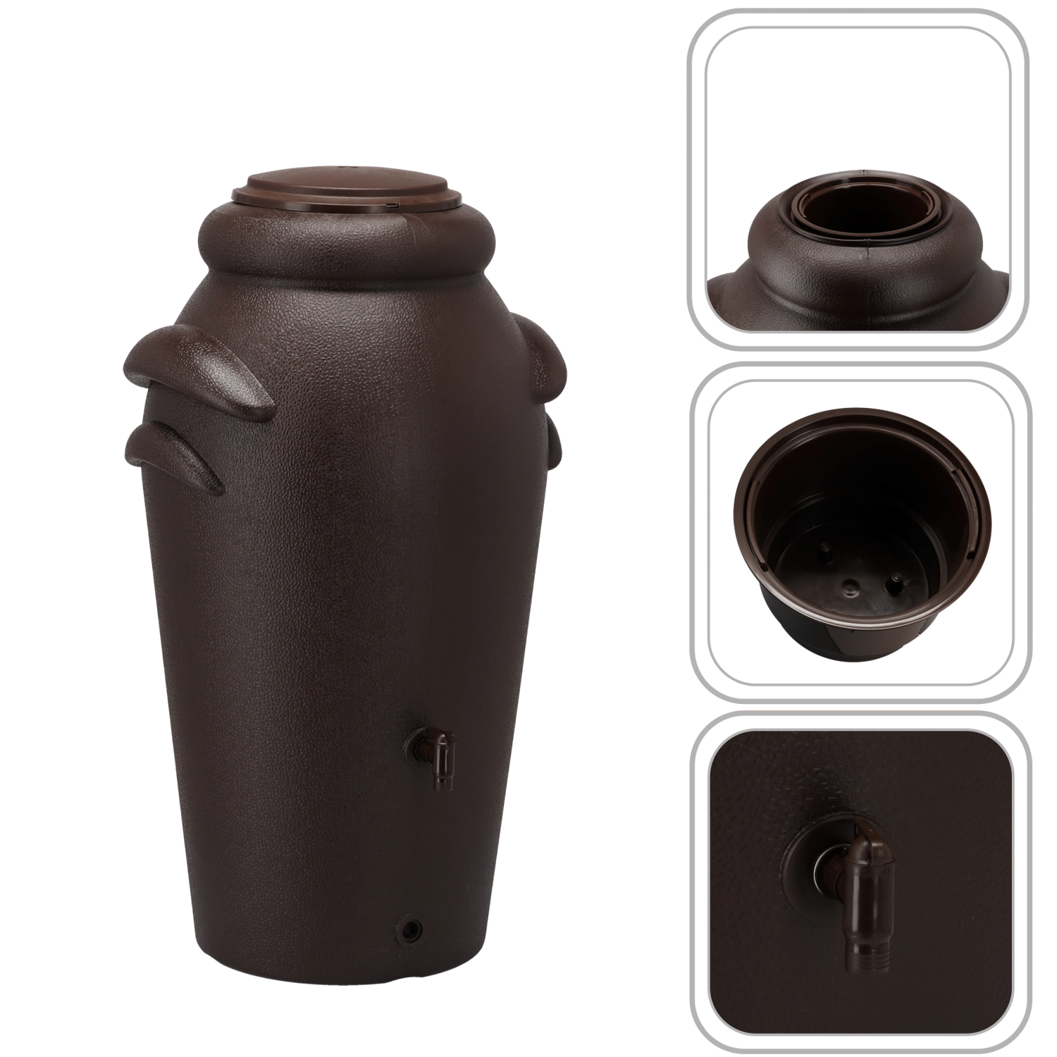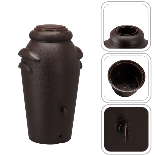 Gromadź i wykorzystuj deszczówkę z głową. Zbiornik VIRGA o pojemności 200 litrów oferuje idealną pojemność do typowych prac ogrodowych, a dzięki wytrzymałemu tworzywu i mrozoodpornemu wykonaniu sprawdza się przez cały rok. Brązowe dekoracyjne wykończenie w formie amfory naturalnie pasuje do domu i pergoli.