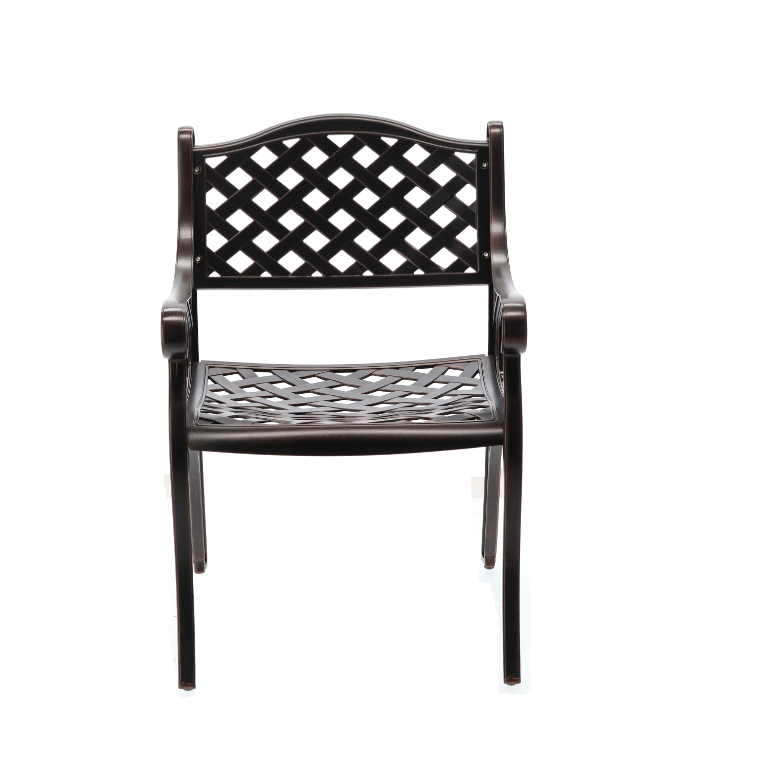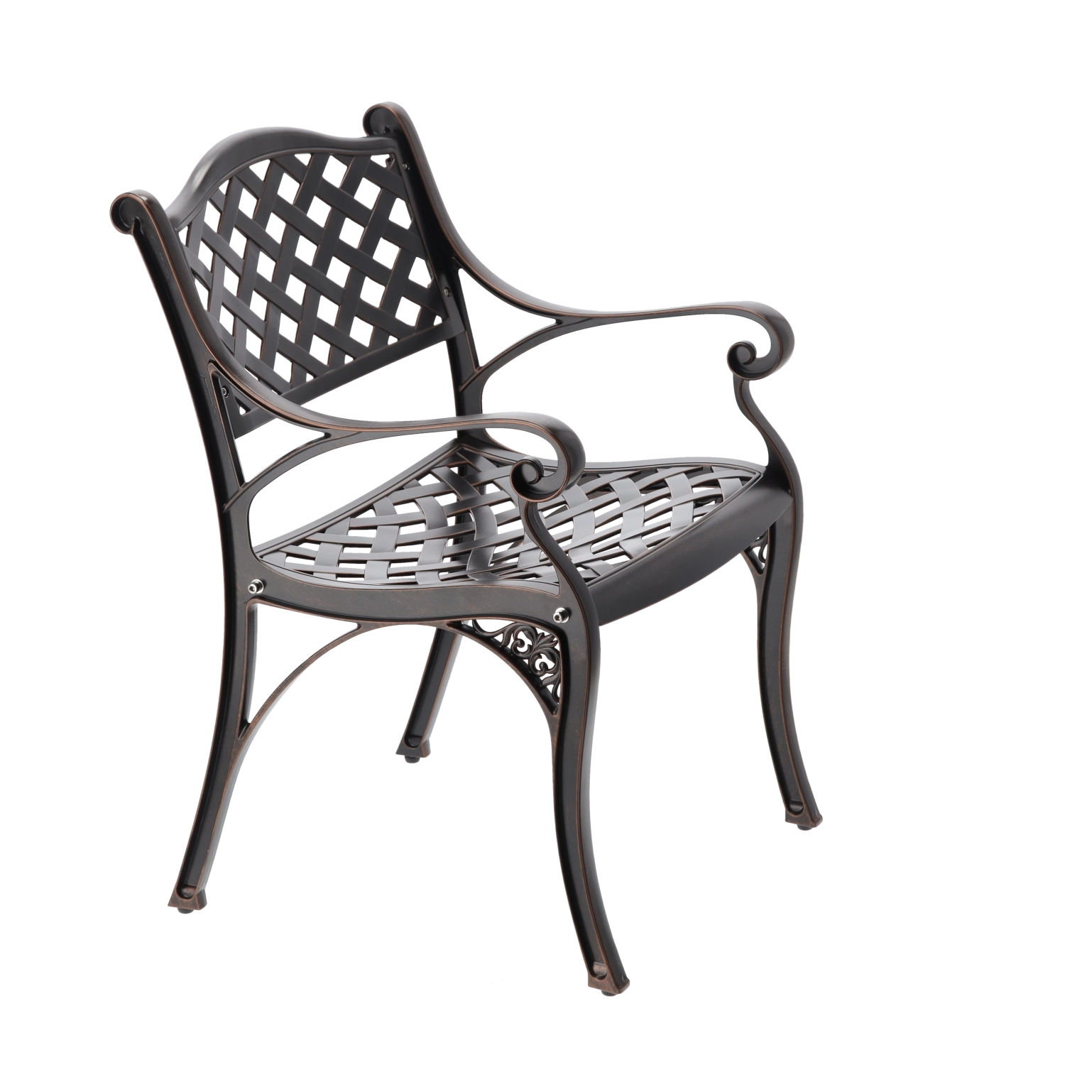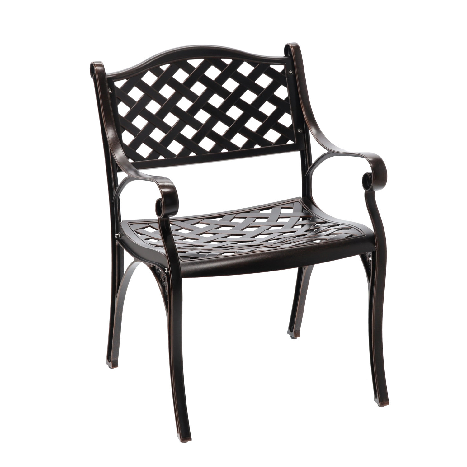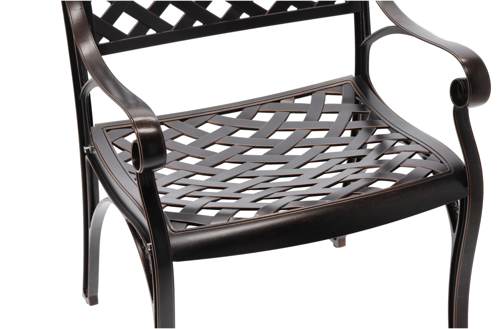 Eleganckie krzesło ogrodowe MONDRICH w odcieniu antycznego brązu łączy klasyczny wygląd z nowoczesną trwałością. Wykonane z pełnych odlewów aluminiowych i pokryte lakierem proszkowym dla ochrony przed warunkami atmosferycznymi. Dzięki niskiej masie, stabilnej konstrukcji oraz wygodnym podłokietnikom jest idealne na taras, balkon, do ogrodu, a także do przestrzeni komercyjnych.