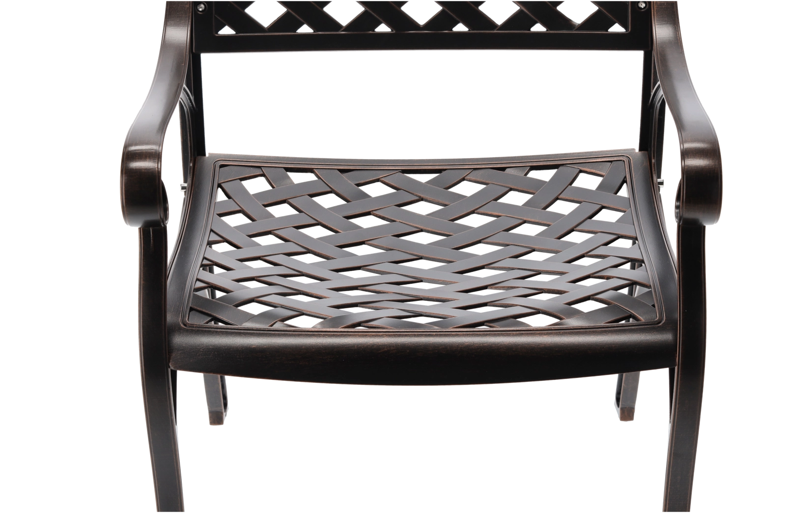Dzięki lekkiemu, lecz wytrzymałemu aluminium krzesło łatwo przenosić, a jednocześnie oferuje pewne podparcie i komfort podczas siedzenia. Ponadczasowy design w antycznym brązie pasuje zarówno do nowoczesnych, jak i tradycyjnych przestrzeni zewnętrznych i łatwo zestawić go ze stołem ogrodowym, tworząc spójną aranżację.
