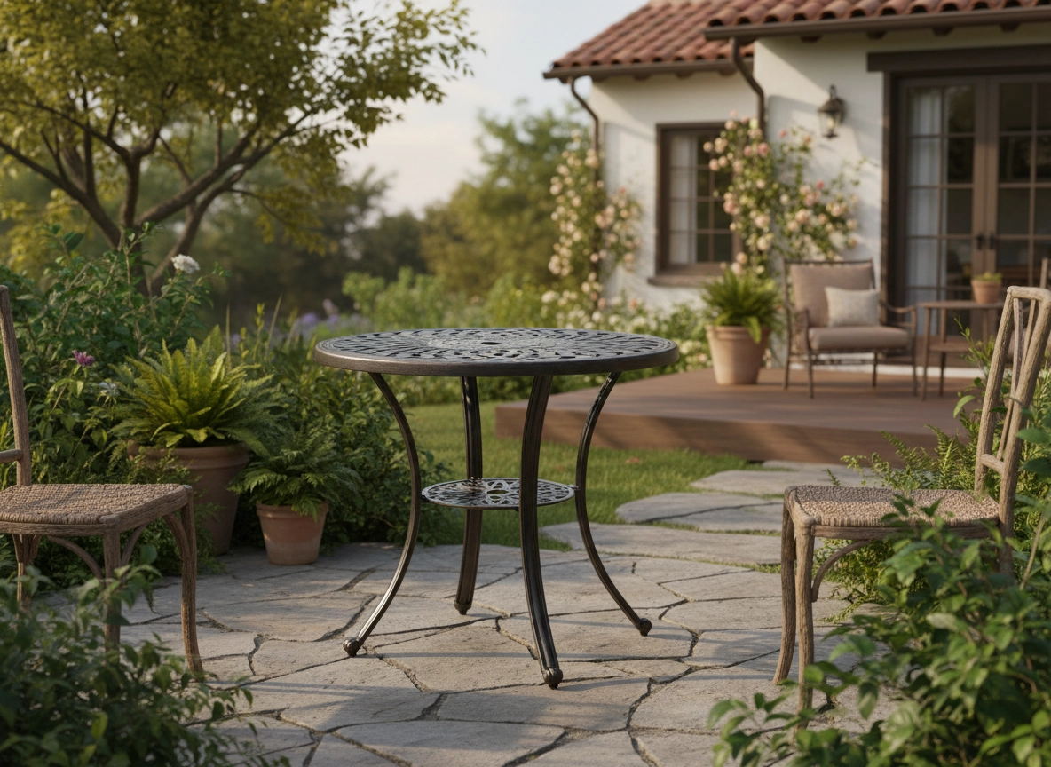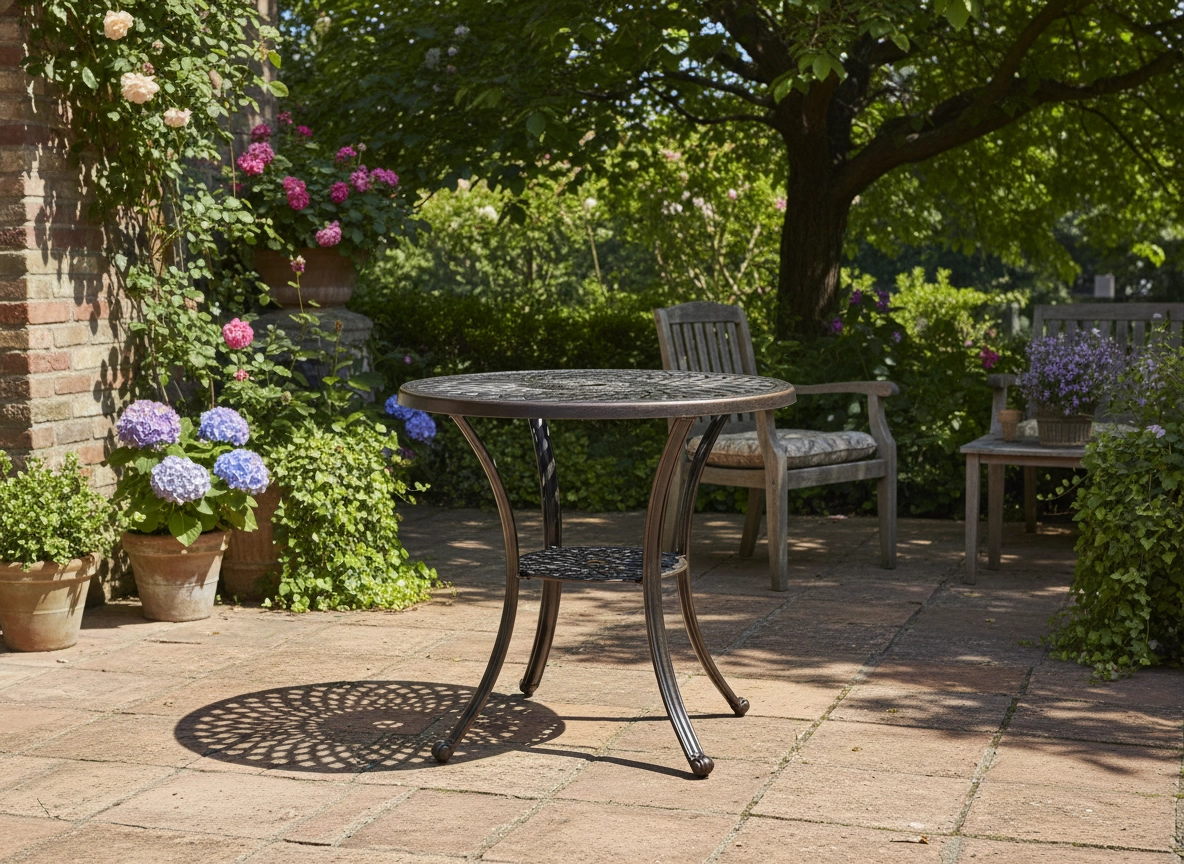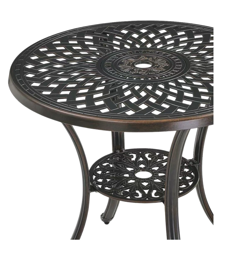 Elegancki aluminiowy stół MONDRICH łączy klasyczny antyczny styl z nowoczesną trwałością. Okrągły blat z dekoracyjnym wzorem i powierzchnia w odcieniu antycznego brązu pięknie prezentują się w ogrodzie, na tarasie i balkonie. Dzięki pełnym odlewom aluminiowym oraz malowaniu proszkowemu jest stabilny, odporny na warunki pogodowe i łatwy w utrzymaniu.