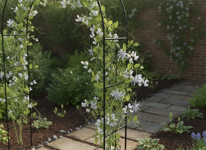 Stal malowana proszkowo zapewnia długą żywotność i odporność na warunki atmosferyczne. W zestawie znajdują się kotwy do solidnego zakotwienia, które zwiększają stabilność konstrukcji nawet przy bujnym wzroście roślin.