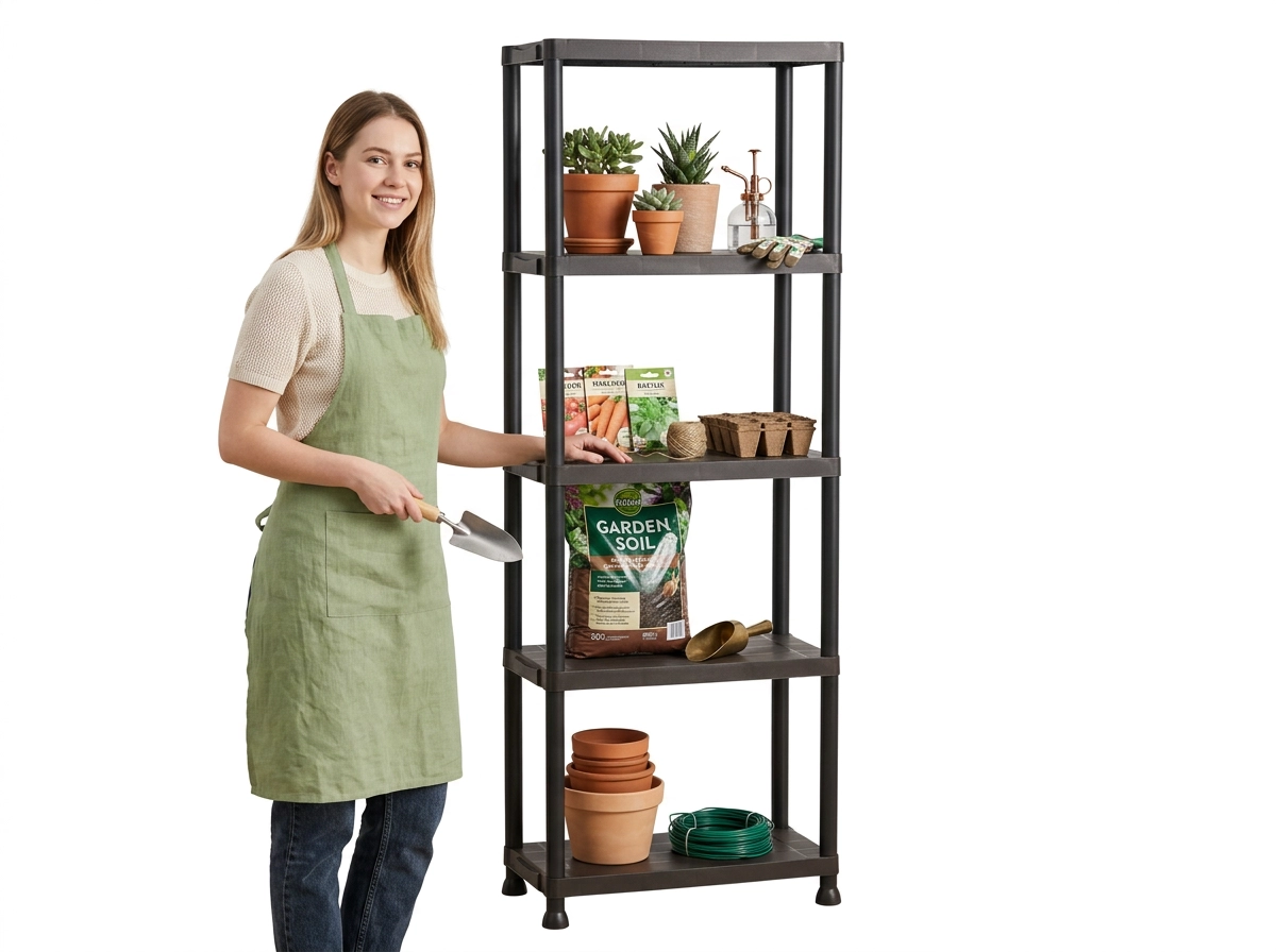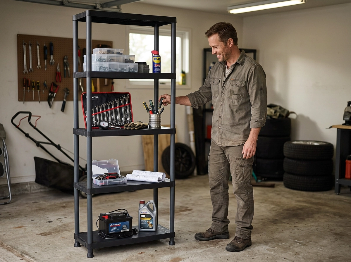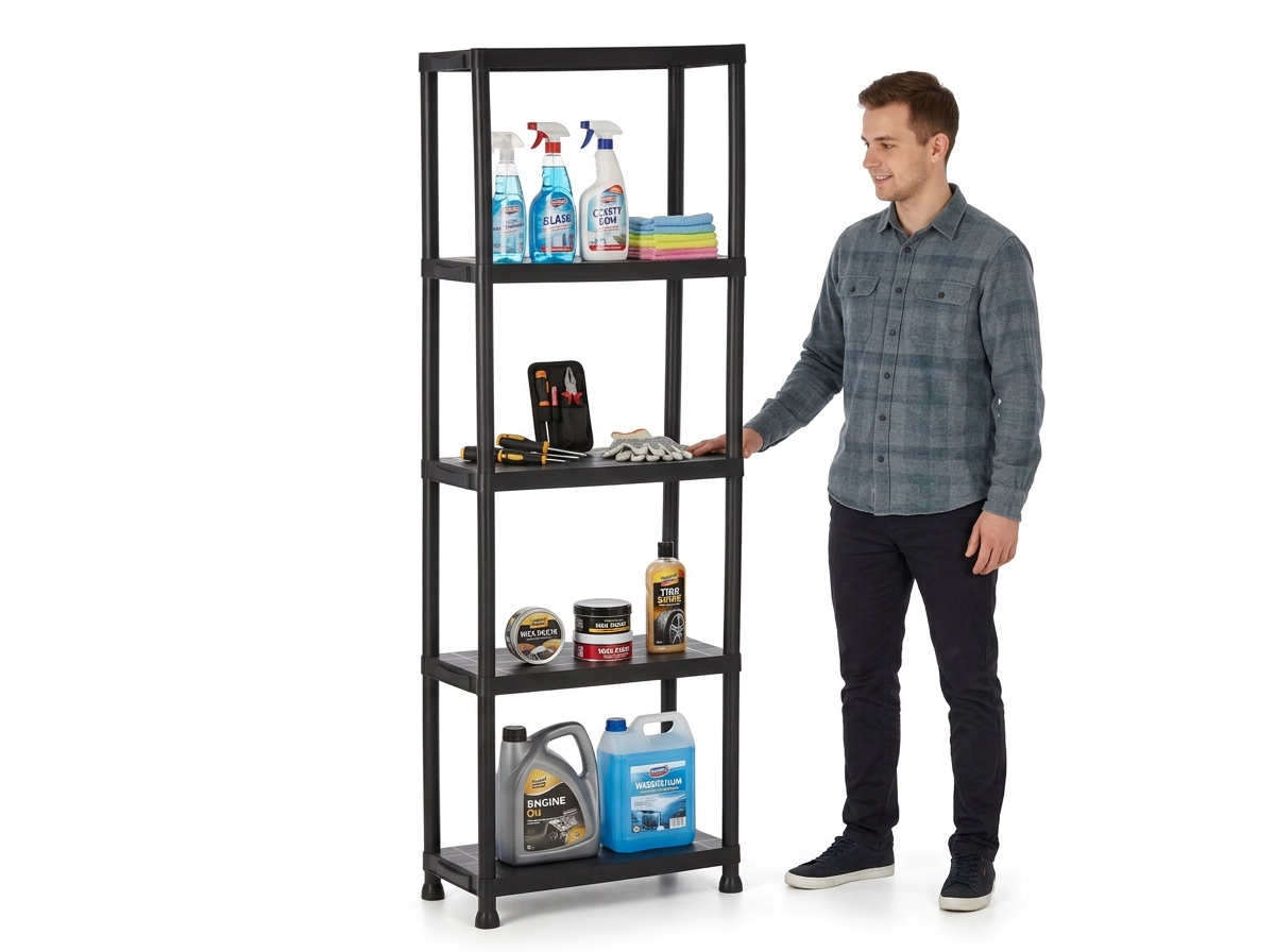 Konstrukcja z tworzywa jest stabilna, odporna na wilgoć i łatwa w czyszczeniu – idealna do garażu, piwnicy i domu.