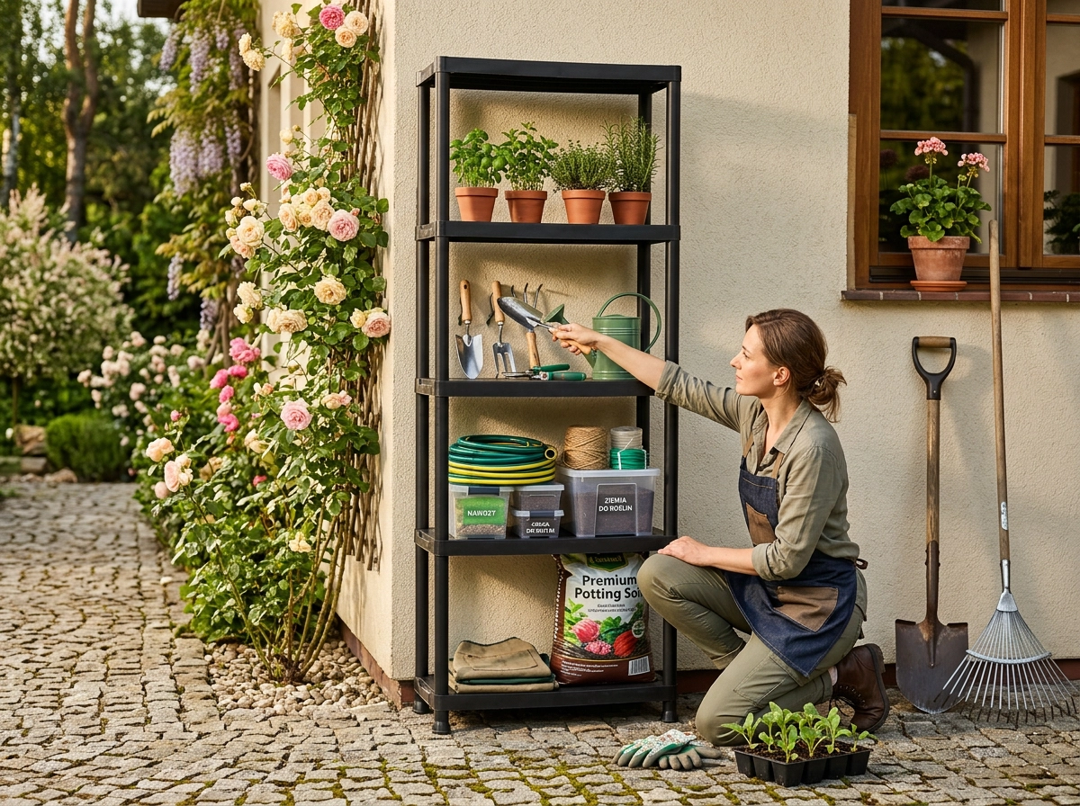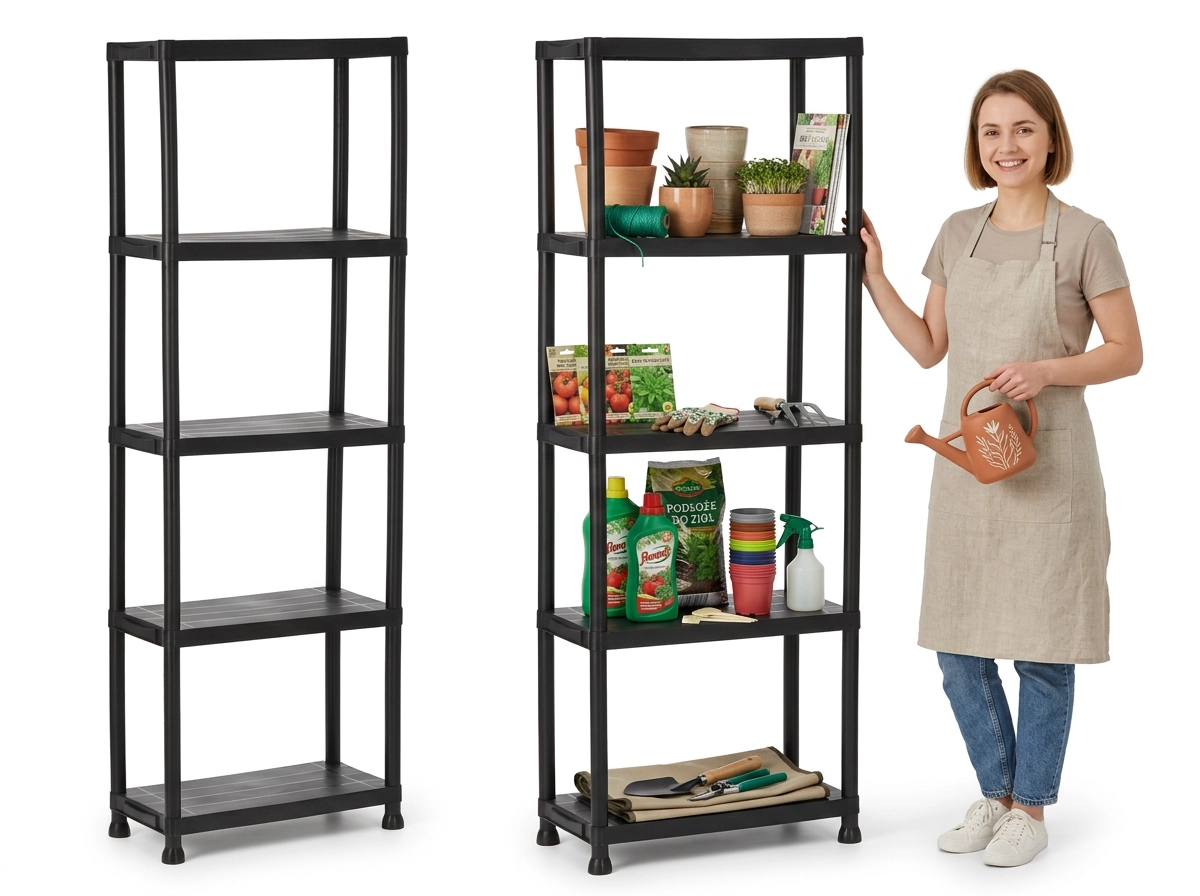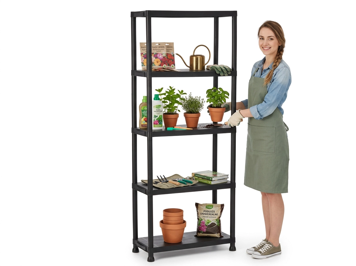 Każdy poziom utrzymuje do 25 kg, więc bezpiecznie przechowasz narzędzia, środki czystości, pojemniki i akcesoria ogrodowe bez uginania.