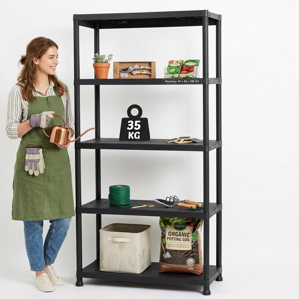 Maksymalnie wykorzystaj przestrzeń do przechowywania dzięki uniwersalnemu plastikowemu regałowi o wymiarach 90 × 40 × 180 cm. Dzięki solidnej konstrukcji i udźwigowi 35 kg na półkę bez problemu pomieści narzędzia, środki czystości, zapasy oraz akcesoria ogrodowe. Odporne tworzywo jest wytrzymałe na warunki atmosferyczne, więc regał niezawodnie sprawdzi się w garażu, piwnicy i zadaszonym exterierze.