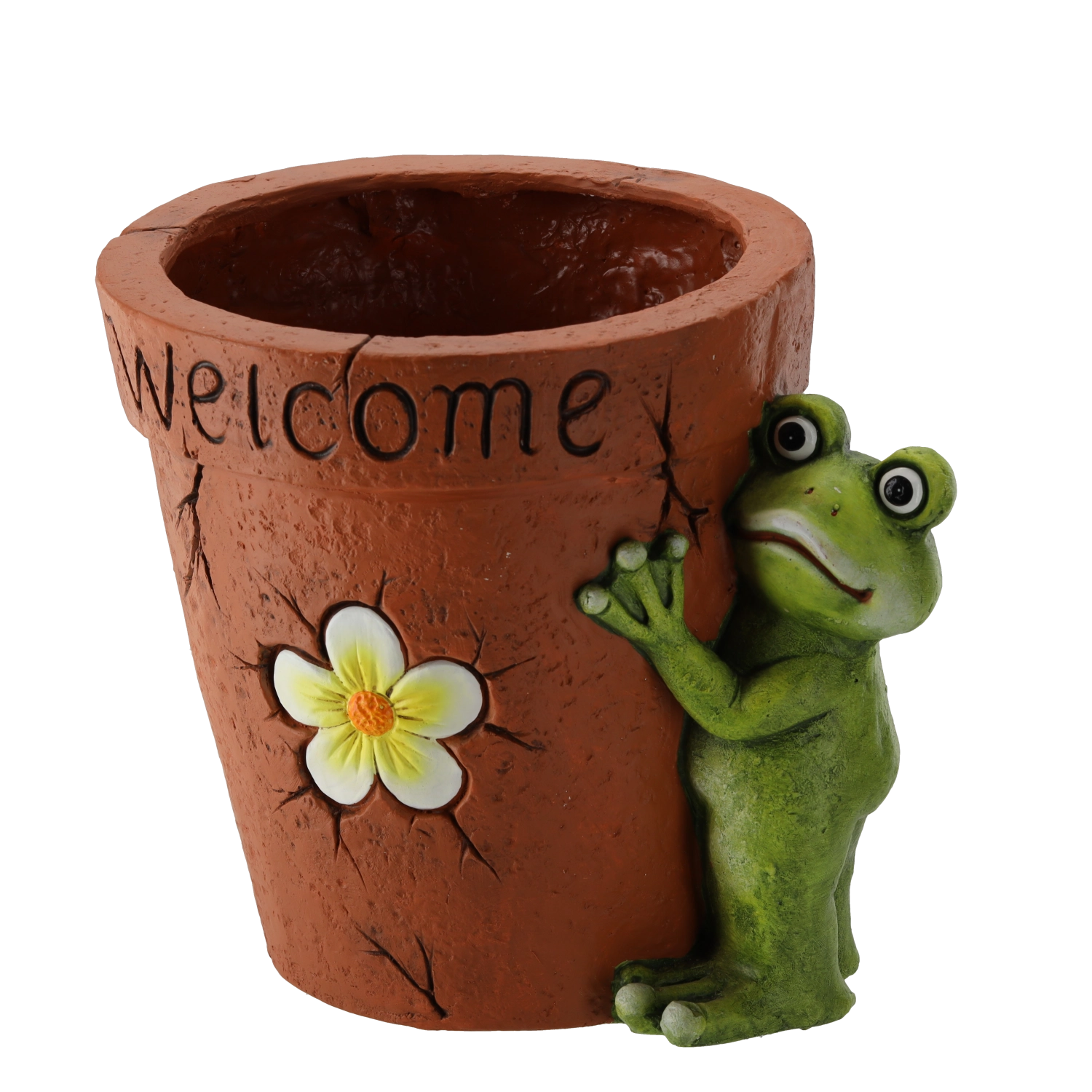 Ożyw swój teren zewnętrzny stylową donicą z figlarnym motywem żaby i kwiatu oraz napisem „Welcome”. Ten dekoracyjny element nada ogrodowi, tarasowi i balkonowi przyjazną atmosferę, oferuje wystarczająco dużo miejsca do nasadzeń i jest wykonany z trwałego materiału o długiej żywotności, odpornego na różne warunki pogodowe.