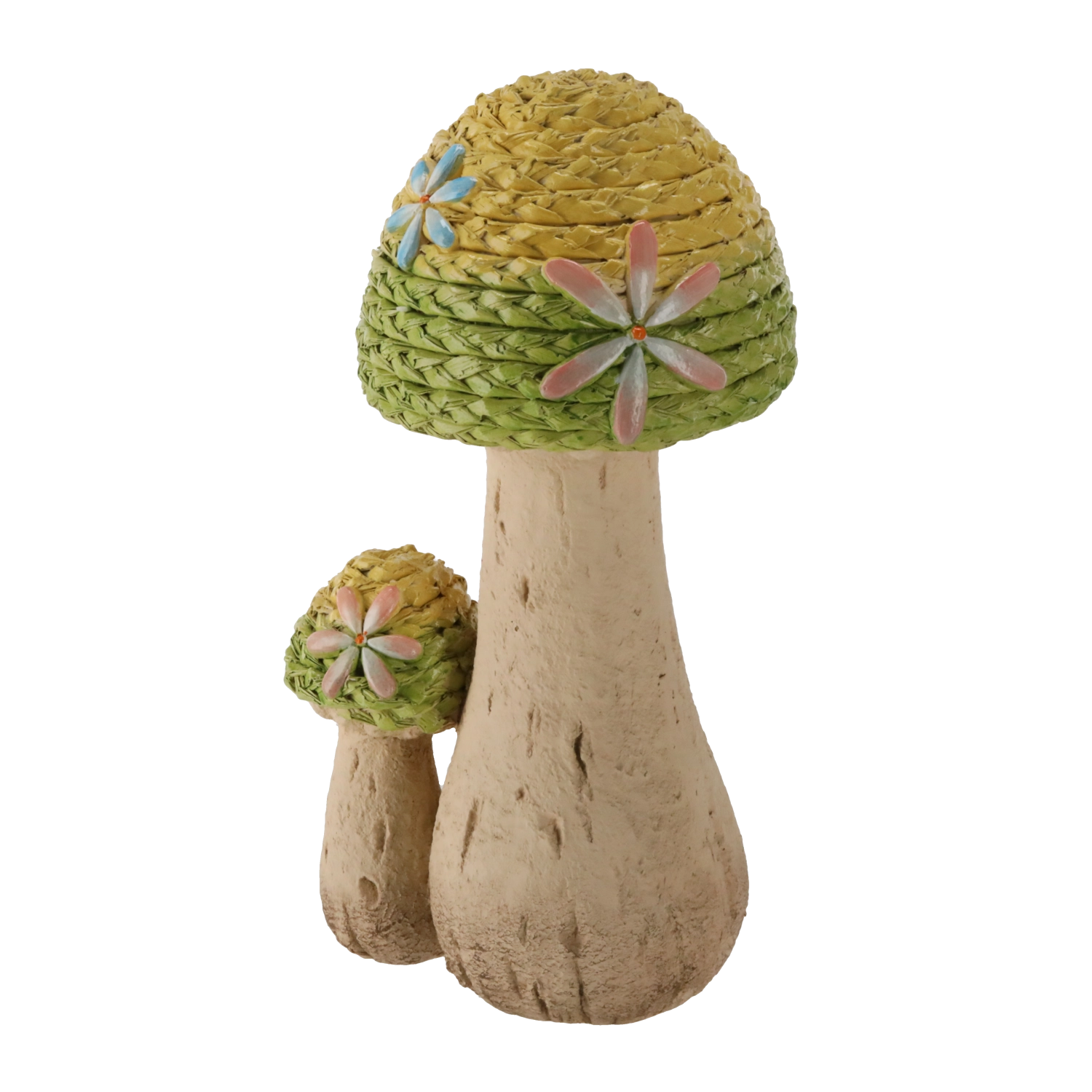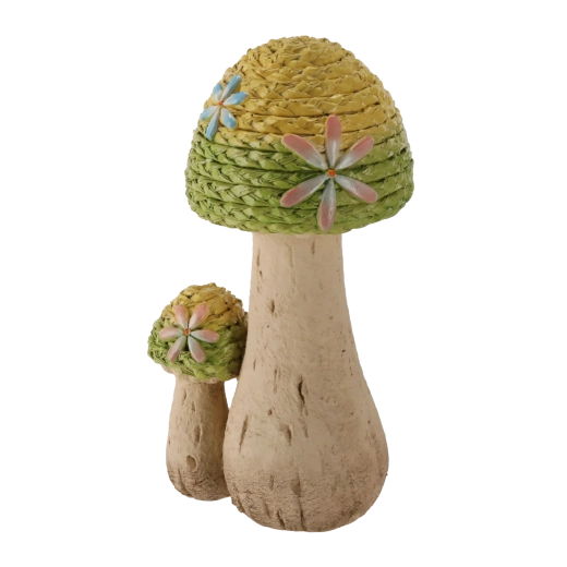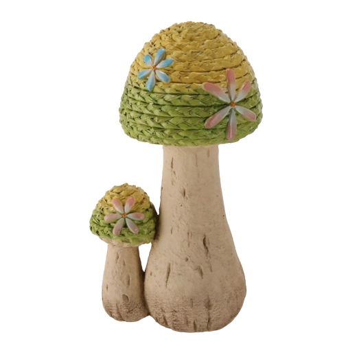 Ta elegancka ogrodowa figurka z motywem plecionych grzybów zachwyca delikatną fakturą i pastelowymi akcentami, które podkreślają jej naturalny, rękodzielniczy charakter. Dzięki stabilnej podstawie łatwo ustawisz ją na różnych powierzchniach na zewnątrz.