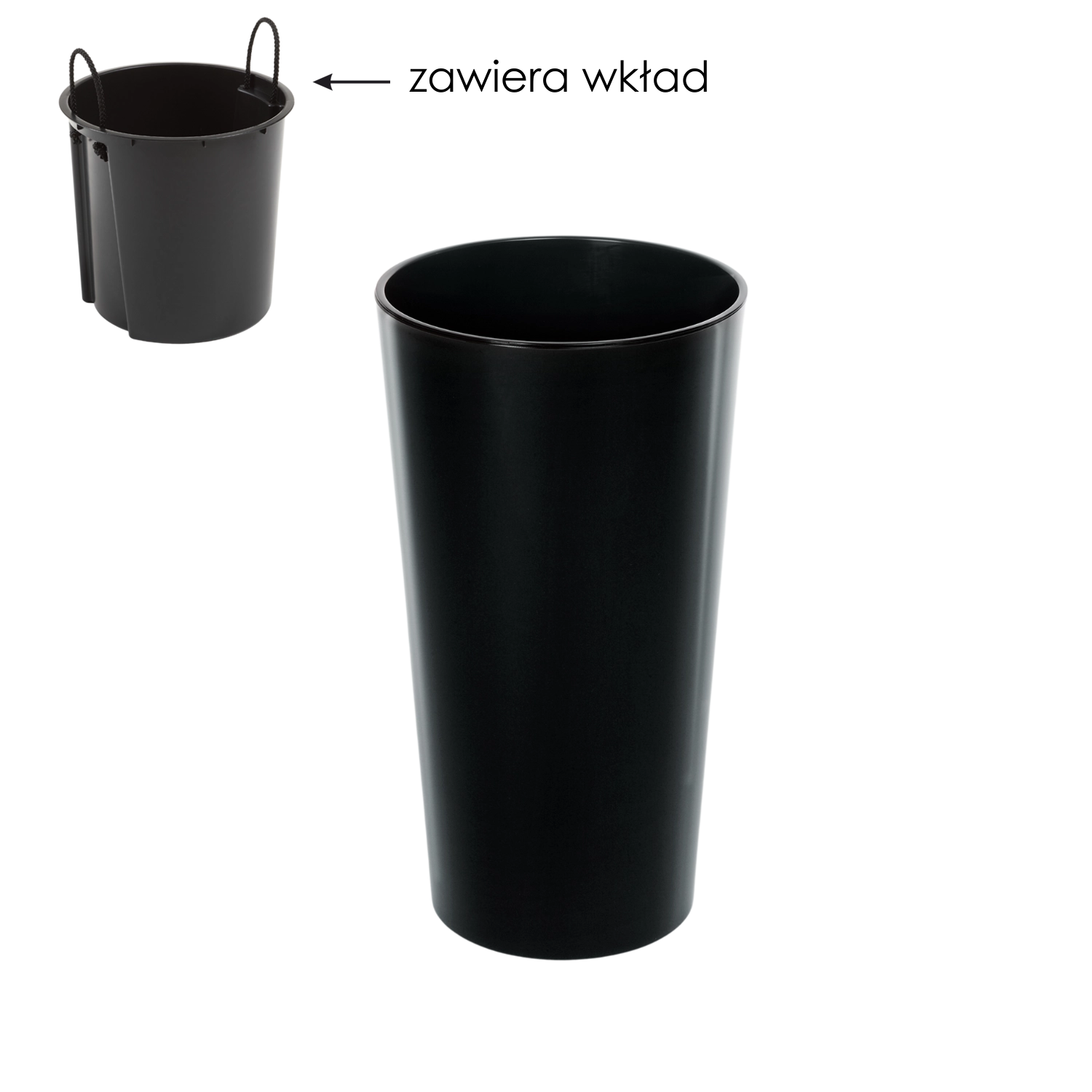 W zestawie znajduje się wyjmowany wkład, który ułatwia manipulację podczas przesadzania. Wkład jest wystarczająco głęboki, zapewnia korzeniom stabilne środowisko, a jednocześnie oszczędza podłoże, ponieważ nie trzeba wypełniać ziemią całego wysokiego korpusu. Zintegrowane rozwiązanie wspiera efektywny drenaż, chroniąc korzenie przed przelaniem i gniciem.