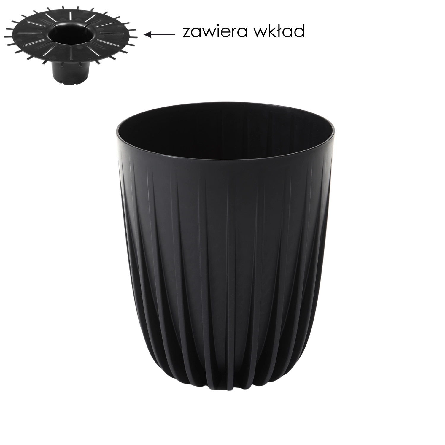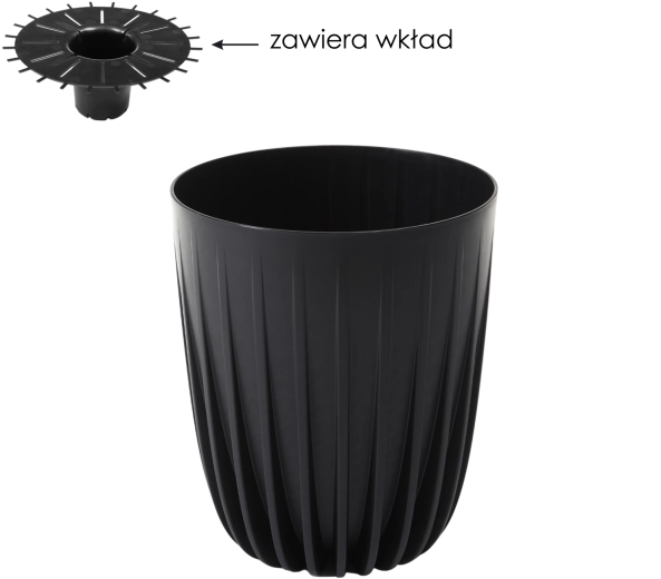Praktyczna wyjmowana wkładka zapewnia efektywne odprowadzanie nadmiaru wody, zapobiegając przelaniu i gniciu korzeni. Wkładkę można wykorzystać także jako podstawkę dla donic produkcyjnych, dzięki czemu doniczka jest uniwersalna dla różnych sposobów uprawy.