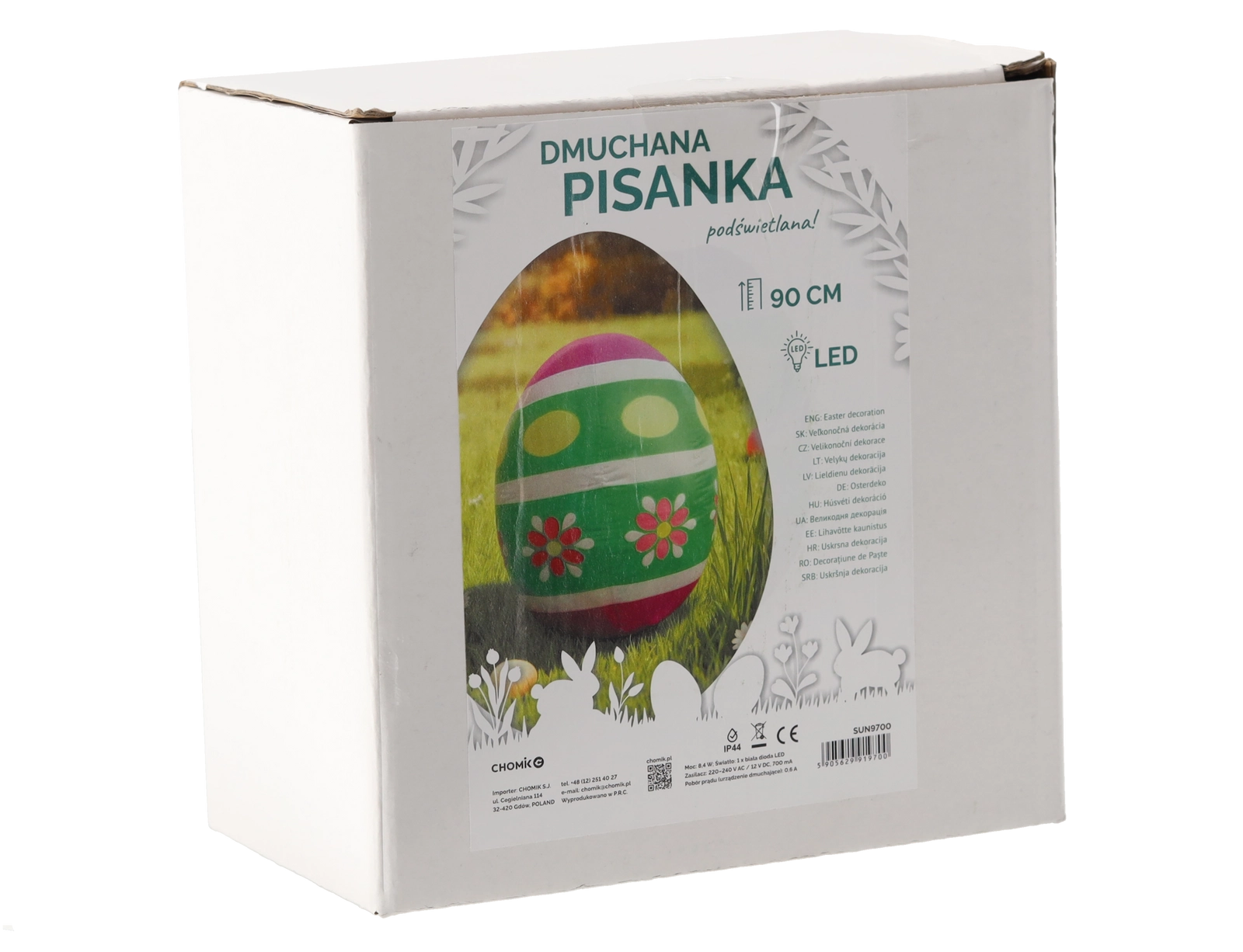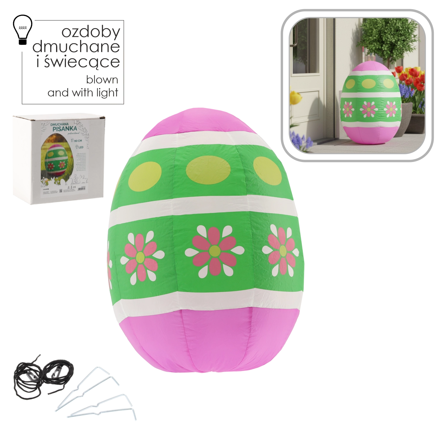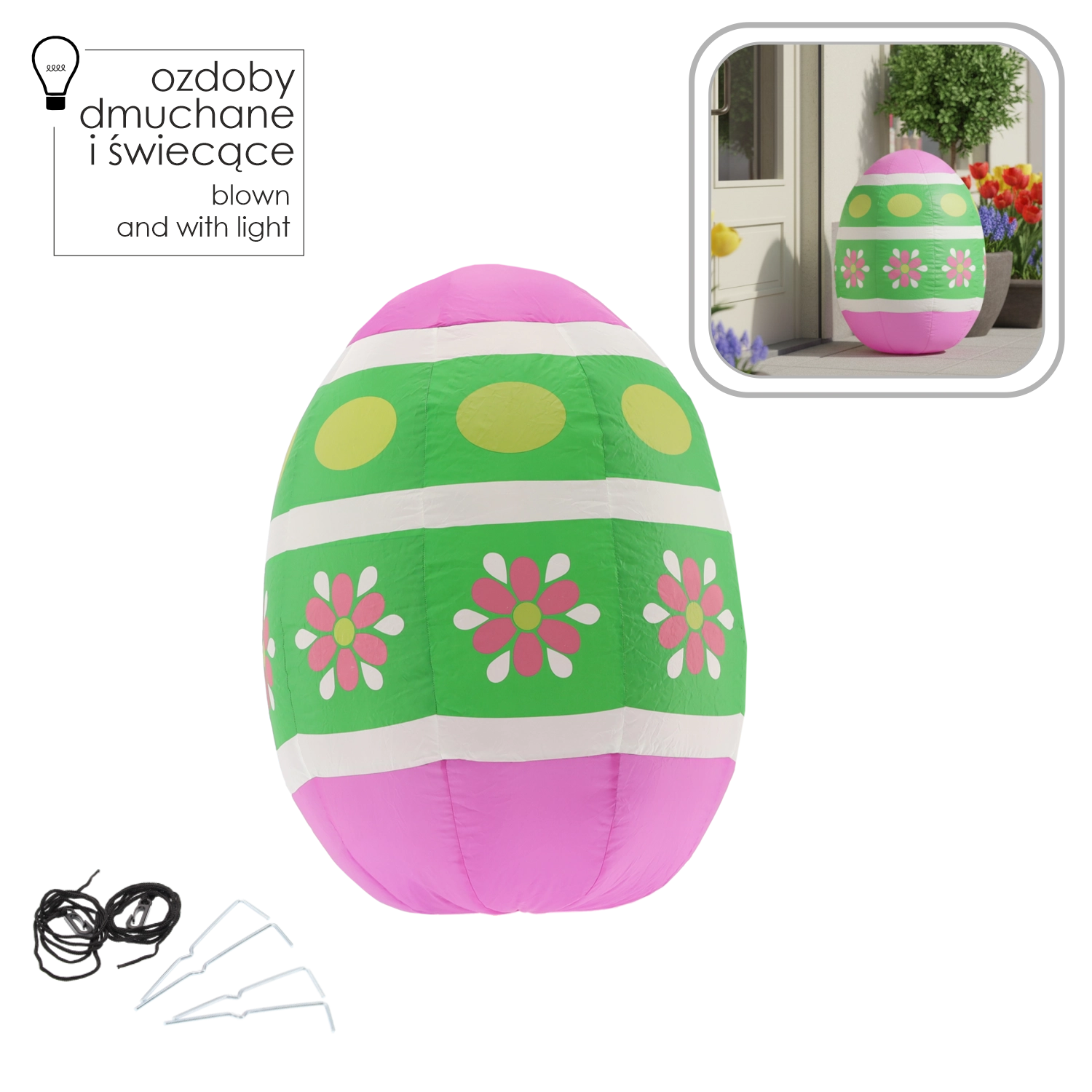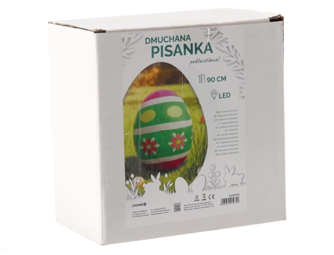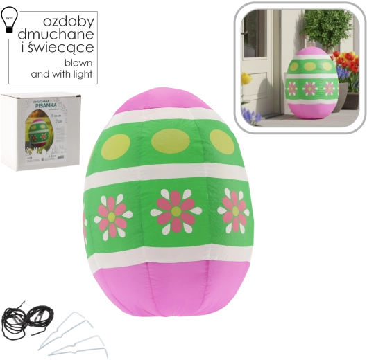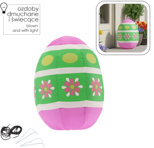 Rozjaśnij ogród i wnętrze radosną dekoracją – nadmuchiwanym wielkanocnym jajkiem o wysokości 90 cm z wbudowaną białą diodą LED. Dzięki klasie szczelności IP44 jest odporne na bryzgającą wodę, ma energooszczędny pobór mocy 8,4 W oraz bezpieczne zasilanie 12 V DC przez adapter.
