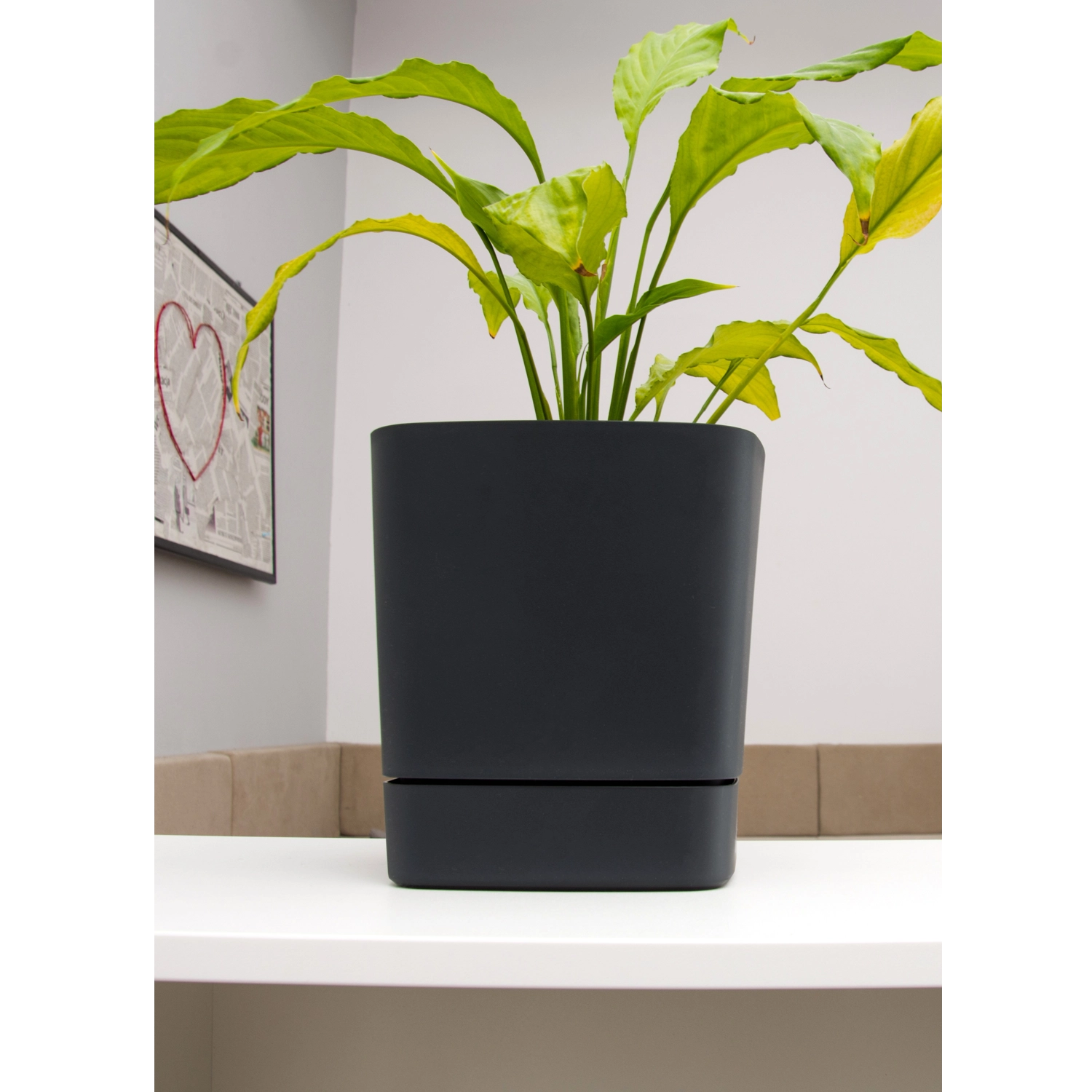 Doniczka z podstawką CLIMA to idealny wybór do nowoczesnych wnętrz i przestrzeni zewnętrznych. Jej geometryczny kształt z delikatnie zaokrąglonymi krawędziami oraz matowa faktura prezentują się elegancko i pasują zarówno do aranżacji minimalistycznych, jak i klasycznych. Czarny odcień podkreśla naturalne piękno roślin i tworzy stylowy akcent na parapecie, tarasie czy balkonie.