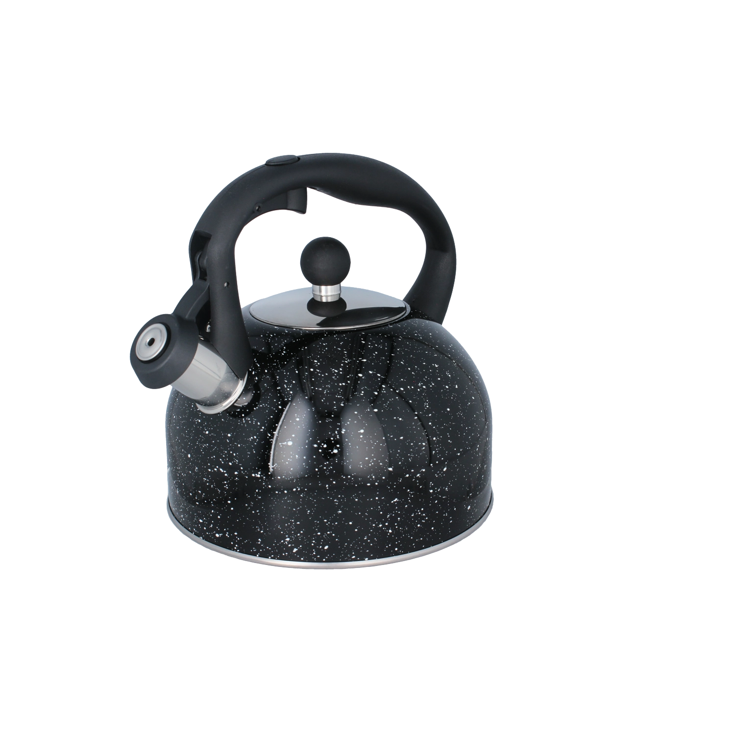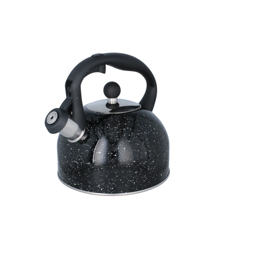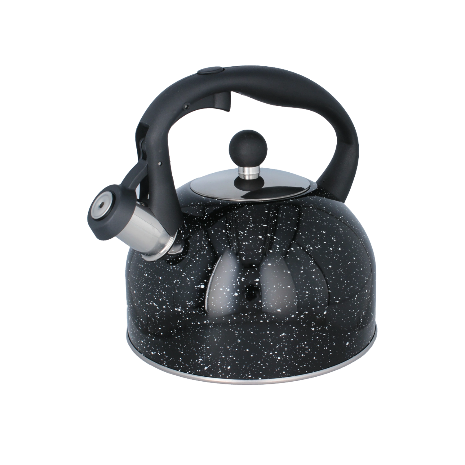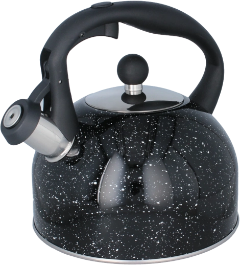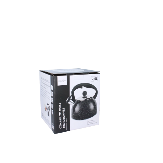 Stylowy czajnik ze stali nierdzewnej z gwizdkiem o pojemności 2,5 l do codziennego użytku. Oferuje wytrzymały korpus ze stali nierdzewnej, atrakcyjną powłokę typu marble w czarnym kolorze z białymi kropkami oraz wygodny, nylonowy uchwyt dla bezpiecznej obsługi.