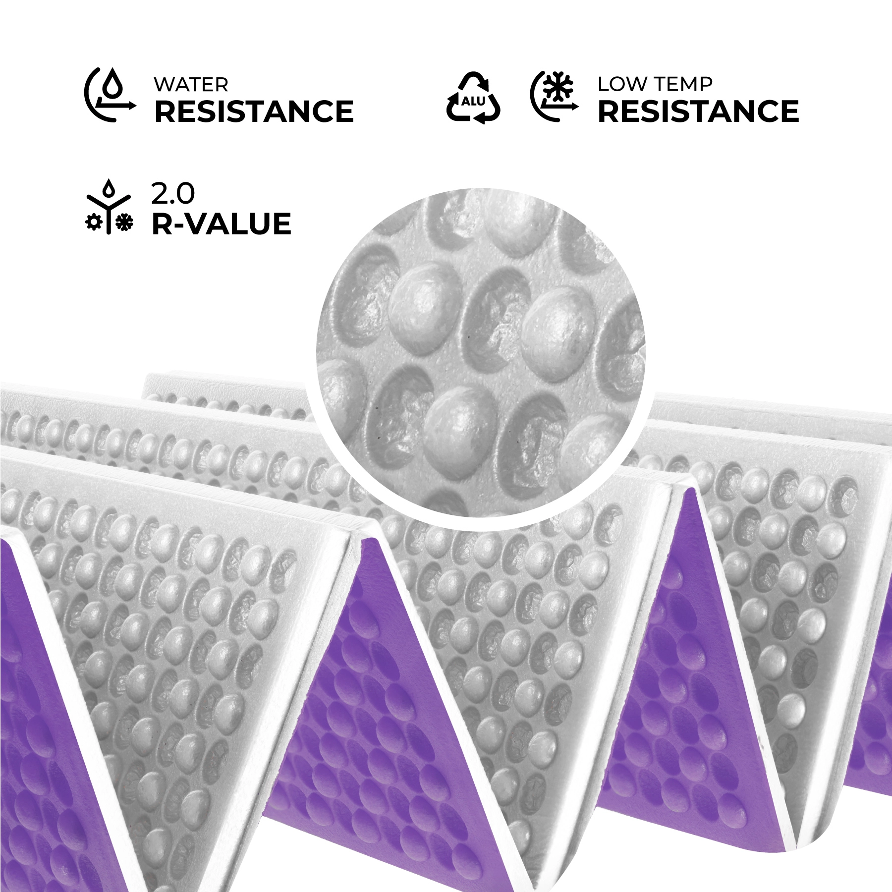 Odbija ciepło ciała z powrotem do użytkownika lub izoluje od zimnego podłoża w zależności od orientacji karimaty. Odpowiednia do użytku trójsezonowego.