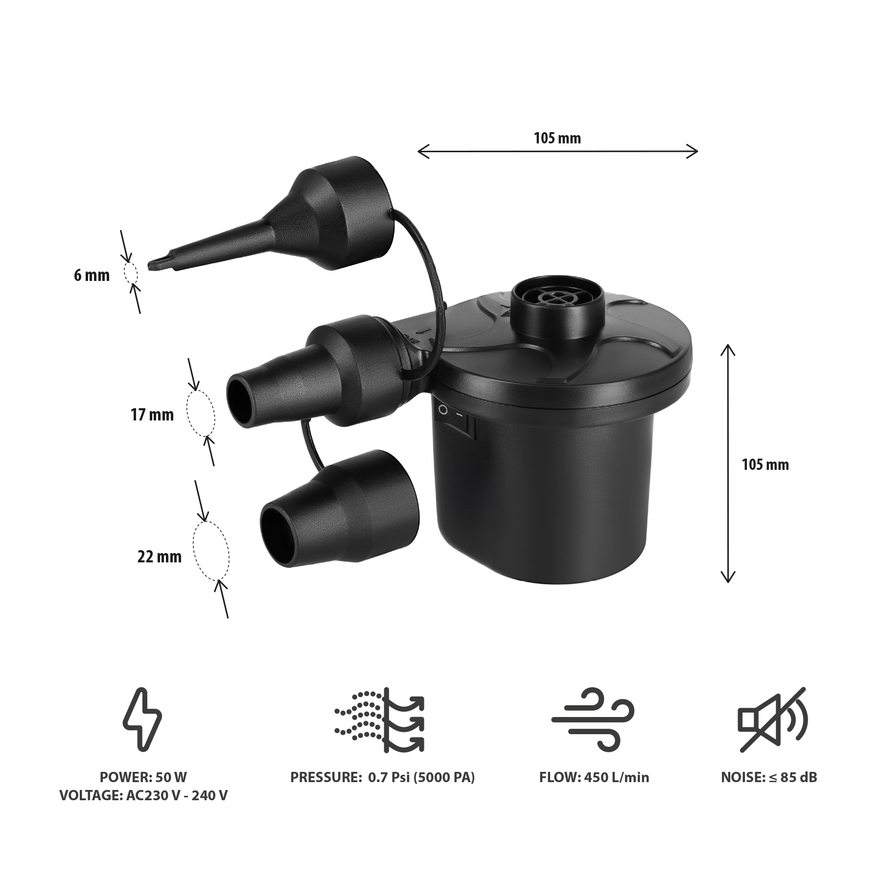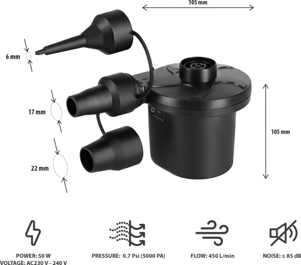 W zestawie znajdziesz zasilacz sieciowy 230 V oraz adapter 12 V do gniazda zapalniczki, więc pompki użyjesz w domu i w podróży. Trzy wymienne nasadki (6/17/22 mm) gwarantują kompatybilność z większością zaworów. Trwałe materiały i niska waga ułatwiają przenoszenie i przechowywanie.