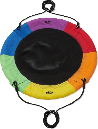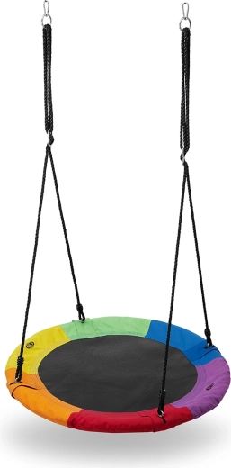 Średnica 90 cm oferuje dużo miejsca do siedzenia i leżenia, dlatego huśtawka świetnie sprawdza się zarówno do relaksu, jak i dynamicznej zabawy. Kolorowa, wyściełana krawędź dodaje atrakcyjnego wyglądu i zwiększa komfort użytkowania. Karabińczyki nie są częścią zestawu, jednak łatwo je dobrać w zależności od sposobu mocowania.