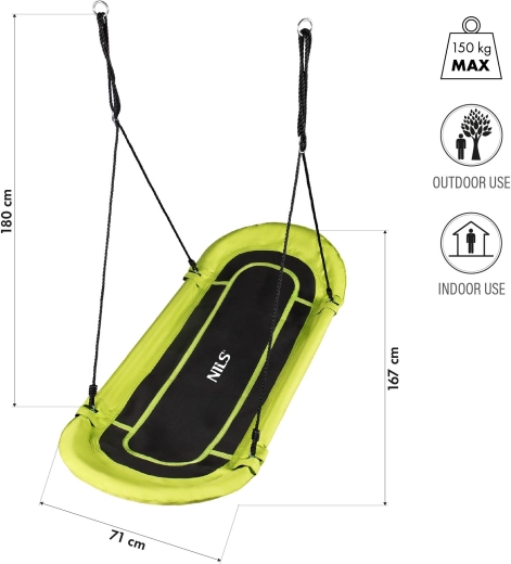 Owalny kształt oferuje więcej miejsca do siedzenia i leżenia, idealny do wspólnych chwil z dziećmi. Regulowane liny do 180 cm umożliwiają uniwersalny montaż na belkach, gałęziach i klasycznych hakach.