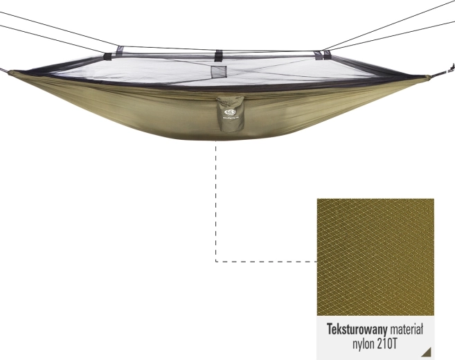 Wytrzymały nylon 210T (70 g/m²) jest lekki, oddychający, odporny na wilgoć i szybko schnie. Po spakowaniu mieści się w zintegrowanym pokrowcu o wymiarach 24 × 13 cm i waży jedynie 0,69 kg, więc idealnie nadaje się do plecaka. Udźwig 180 kg oraz mocne końcowe przelotki z karabińczykami zapewniają niezawodne zawieszenie.