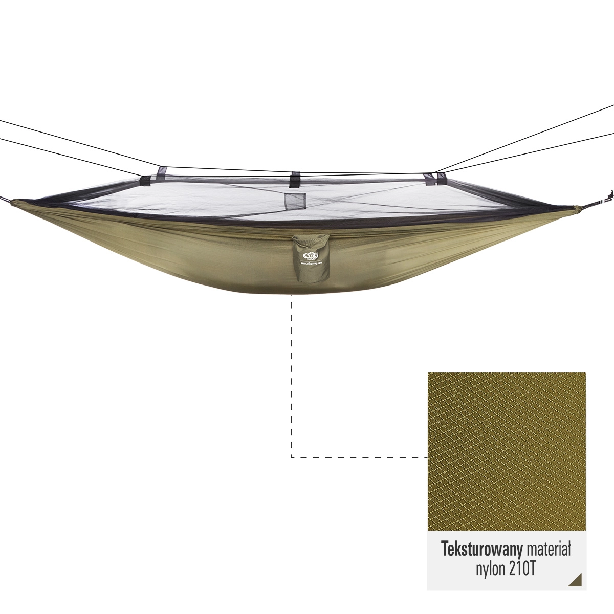 Korzystaj z wygody i ochrony na łonie natury z hamakiem NILS Camp NC3116. Zintegrowana moskitiera zapinana na zamek i napinana linkami w czterech punktach tworzy skuteczną barierę przeciw owadom. Do hamaka wchodzi się jak do „kieszeni”, co zwiększa stabilność i bezpieczeństwo podczas snu i relaksu.