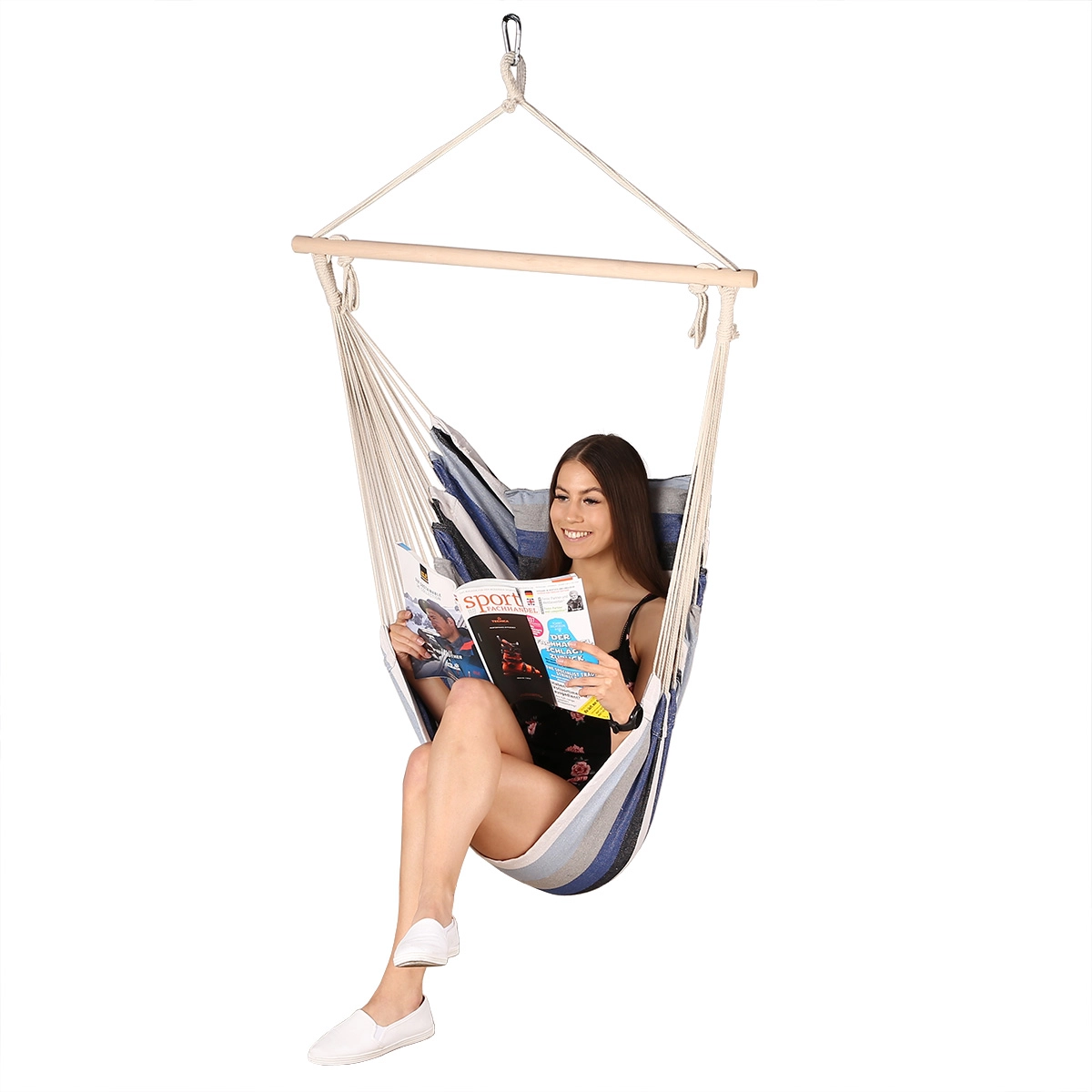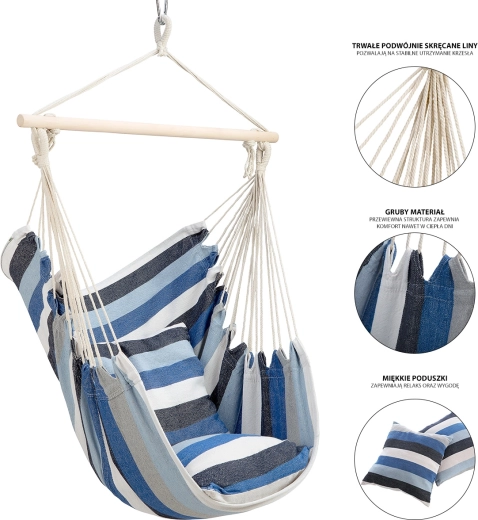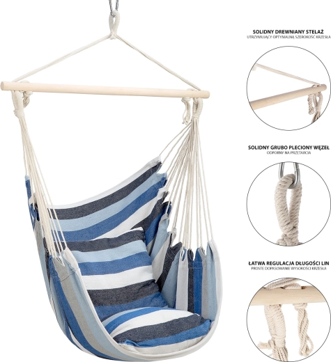 Ciesz się doskonałym relaksem w ogrodzie, na balkonie lub podczas biwakowania. Ten zawieszany brazylijski fotel z oddychającego płótna T/C (poliester + bawełna) oferuje wygodne siedzenie z dwoma miękkimi poduszkami, solidną drewnianą poprzeczką oraz prostym zawieszeniem na jedno ucho. Udźwig 100 kg i niska waga czynią go idealnym wyborem do codziennego relaksu.