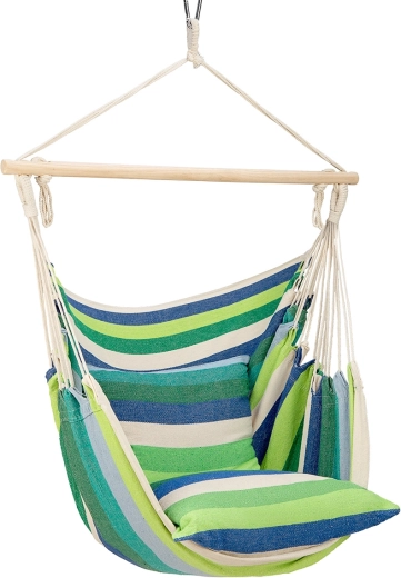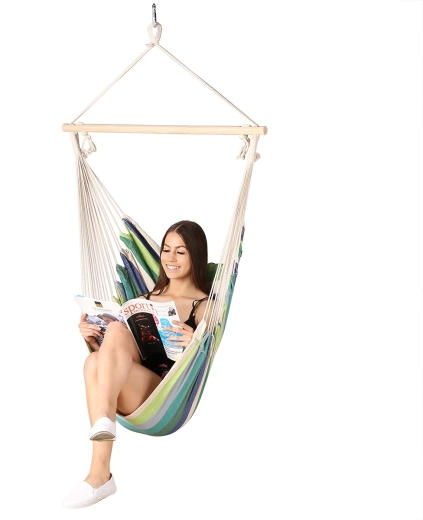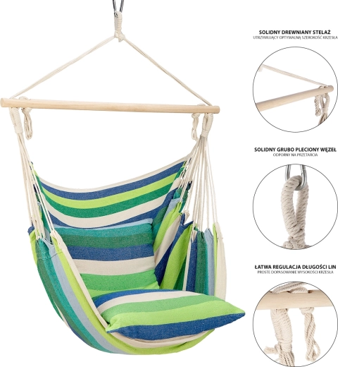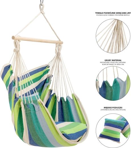Wystarczy go rozpakować, zawiesić na odpowiedniej wysokości i już można odpoczywać z ulubioną książką. Dwie wygodne poduszki podpierają plecy i kark, a mocne uchwyty do zawieszenia oraz solidne liny zapewniają bezpieczne bujanie do 100 kg. Praktyczne wymiary i niska waga ułatwiają przenoszenie i przechowywanie.