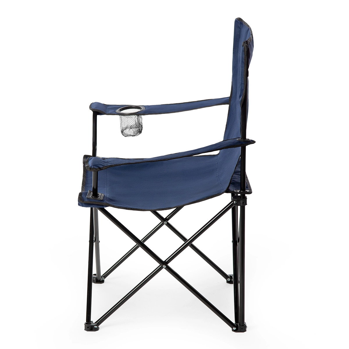 Przemyślane detale zwiększają komfort siedzenia: regulowane podłokietniki łatwo dopasujesz, a w zintegrowanym uchwycie na napój bezpiecznie odłożysz butelkę lub kubek. Plastikowe nóżki z kwadratową podstawą gwarantują stabilność i zapobiegają zapadaniu się w miękkim podłożu. Po zakończonym dniu złożysz je w kilka chwil do kompaktowych rozmiarów, co ułatwia transport.